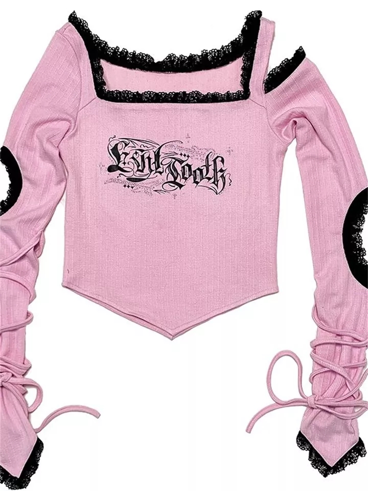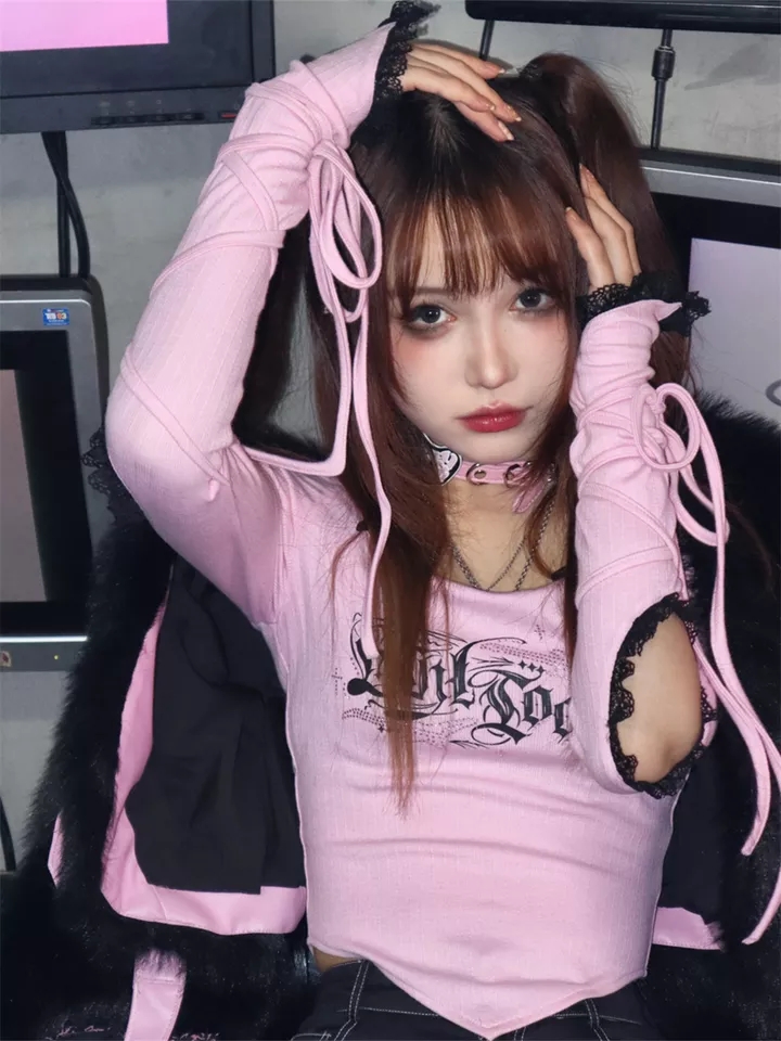 Pink Goth Bandage Hollow Out Long Sleeve T-shirt