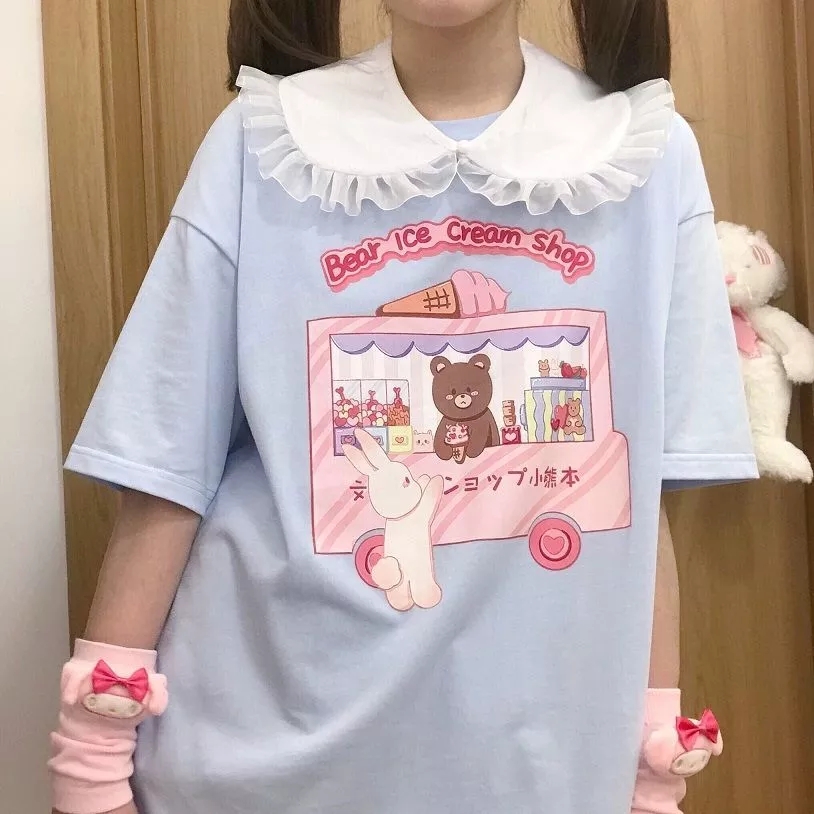 Sweet Bear Ice Cream Shop Print Loose Short Sleeve T-shirt