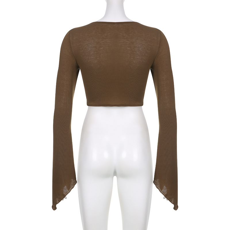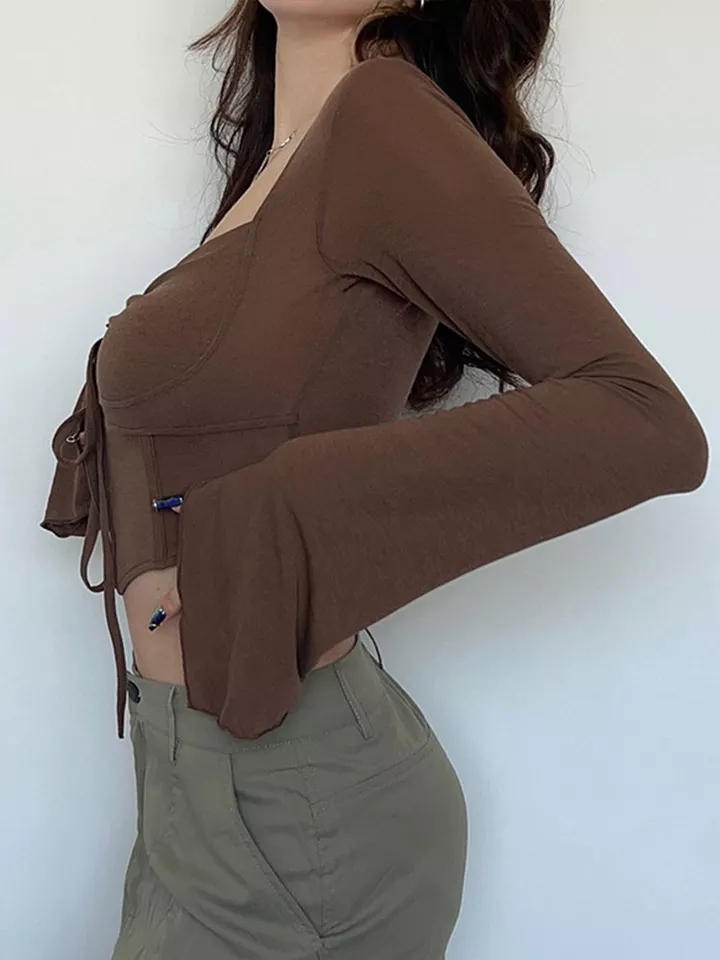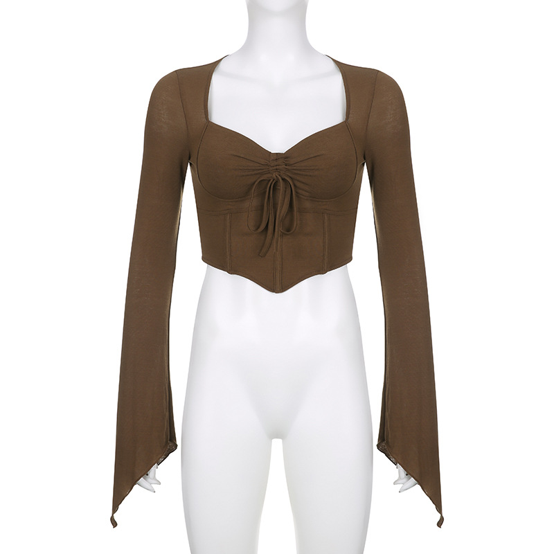 Cute Pink Back Puff Sleeve French Bow Bandage Long Sleeve Shirt Blouse Crop Top Square Neck Aesthetic Casual E-Girl Kawaii Korean Japanese Harajuku