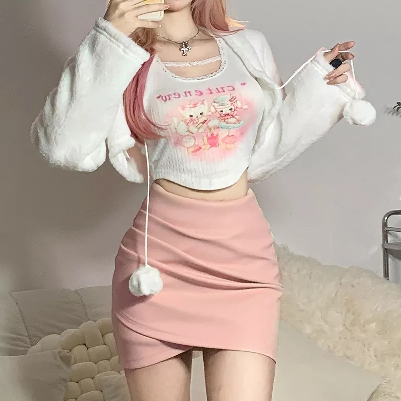 Cute Pink Strawberry V Neck Sleeveless Knit Crop Top Sweater Sweatshirt Pullover Jumper E-Girl Kawaii Korean Japanese Harajuku Streetwear