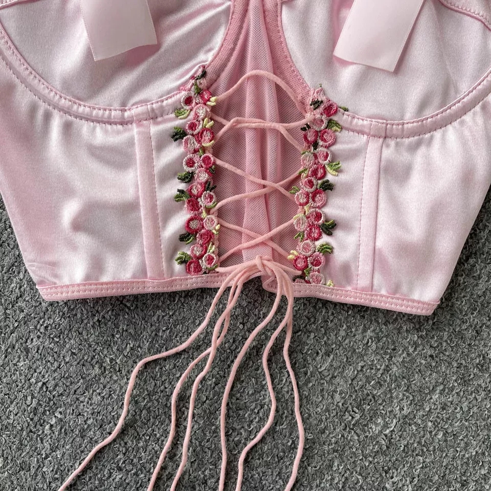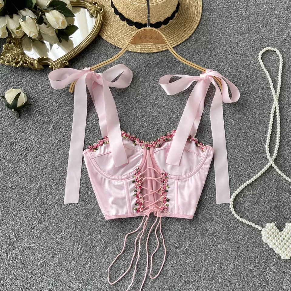 Sexy Pink Ribbon Bow Mesh Panel V Neck Crop Top Camisole Sleeveless Shirt Summer Goth Aesthetic E-Girl Kawaii Korean Japanese Harajuku Streetwear