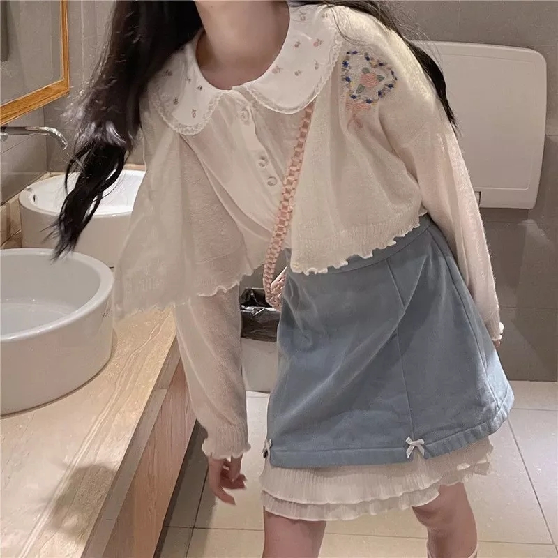 White Preppy Flower Embroidery Short Sleeve Blouse