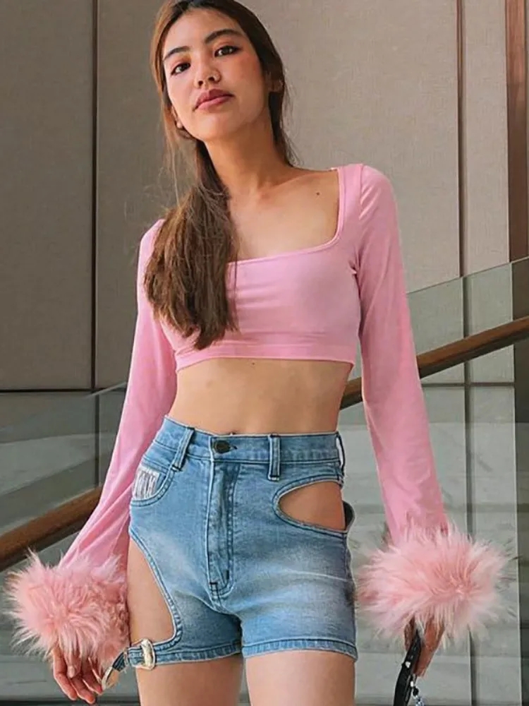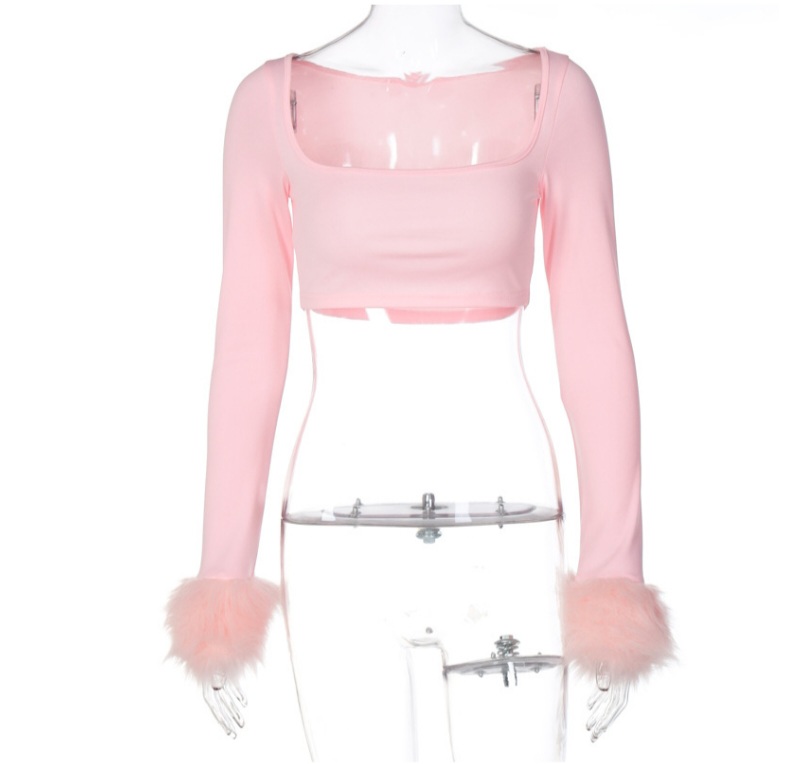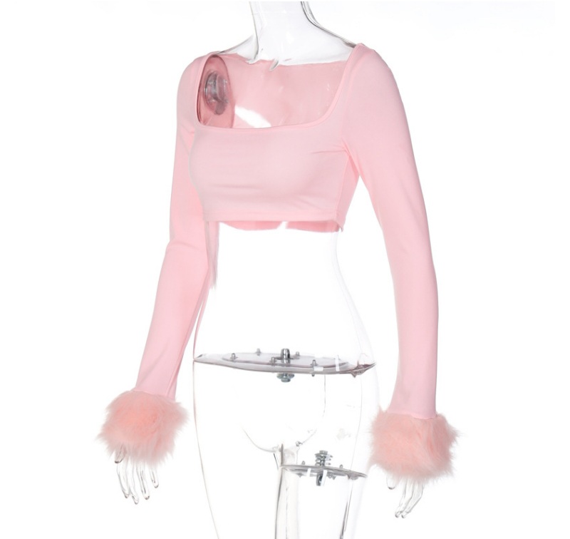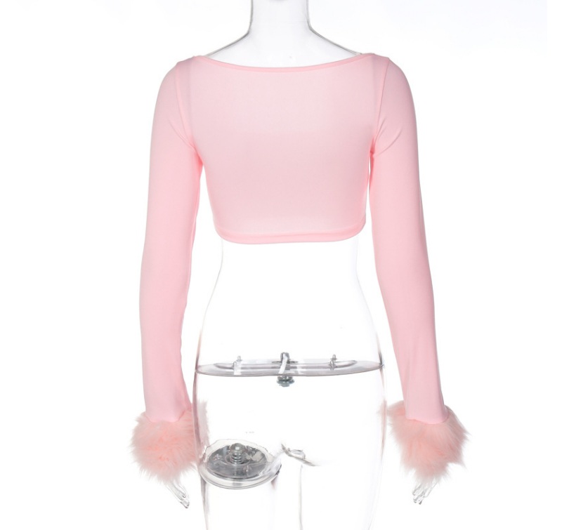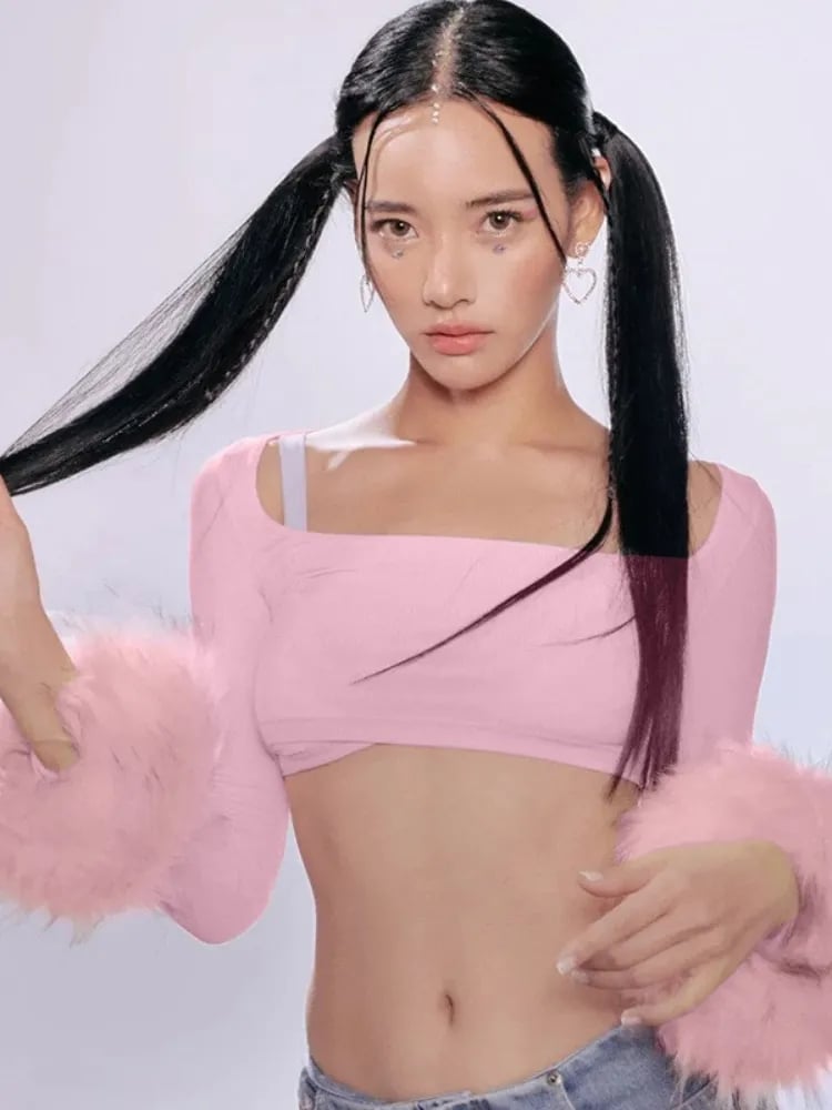 Pink Furry Cuff Long Sleeve Crop Top