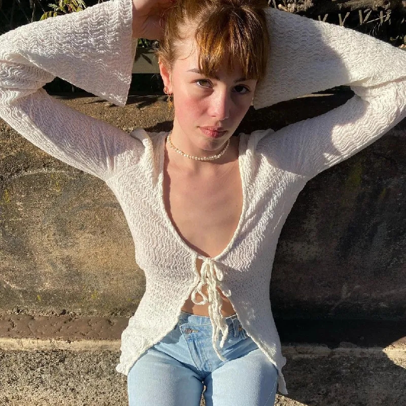White Lace Up Long Sleeve Flare Cardigan