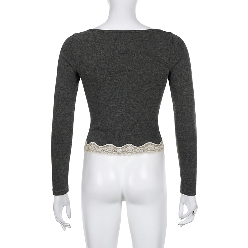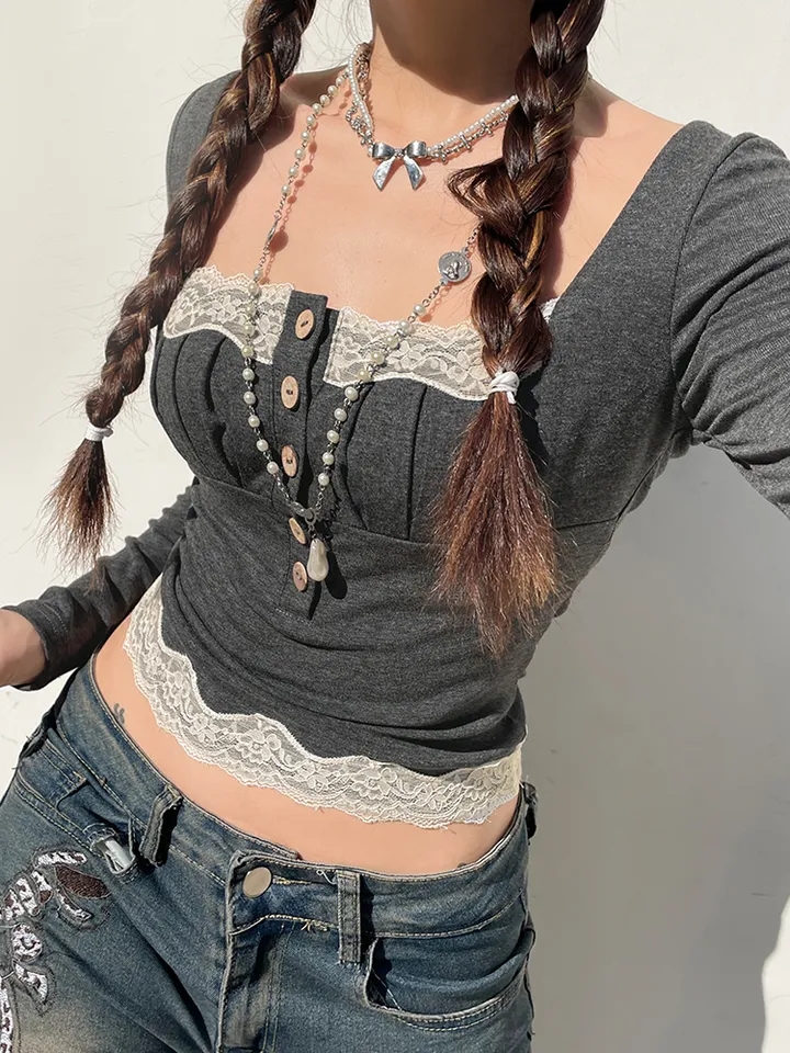 Grey Patchwork Square Neck Collar Long Sleeve Shirt