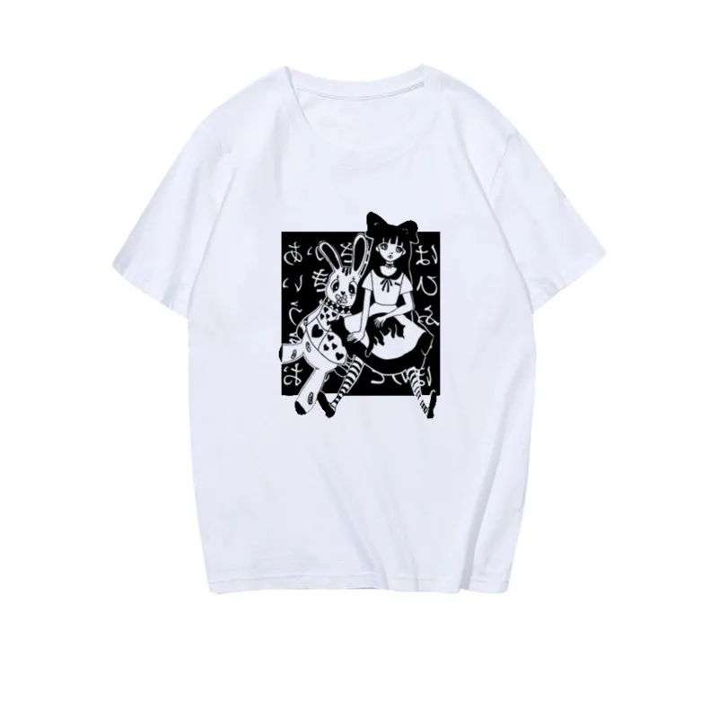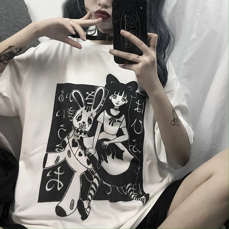 Sweet Bear Anime Cartoon Print Loose Short Sleeve T-shirt Top Summer Causal Goth Punk E-Girl Kawaii Korean Japanese Harajuku Streetwear