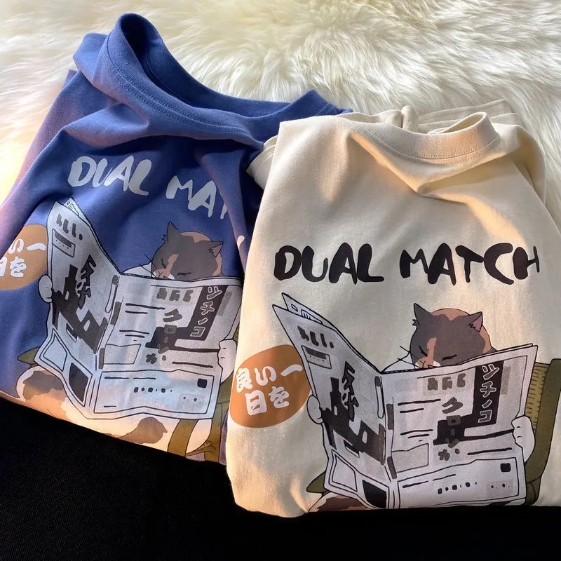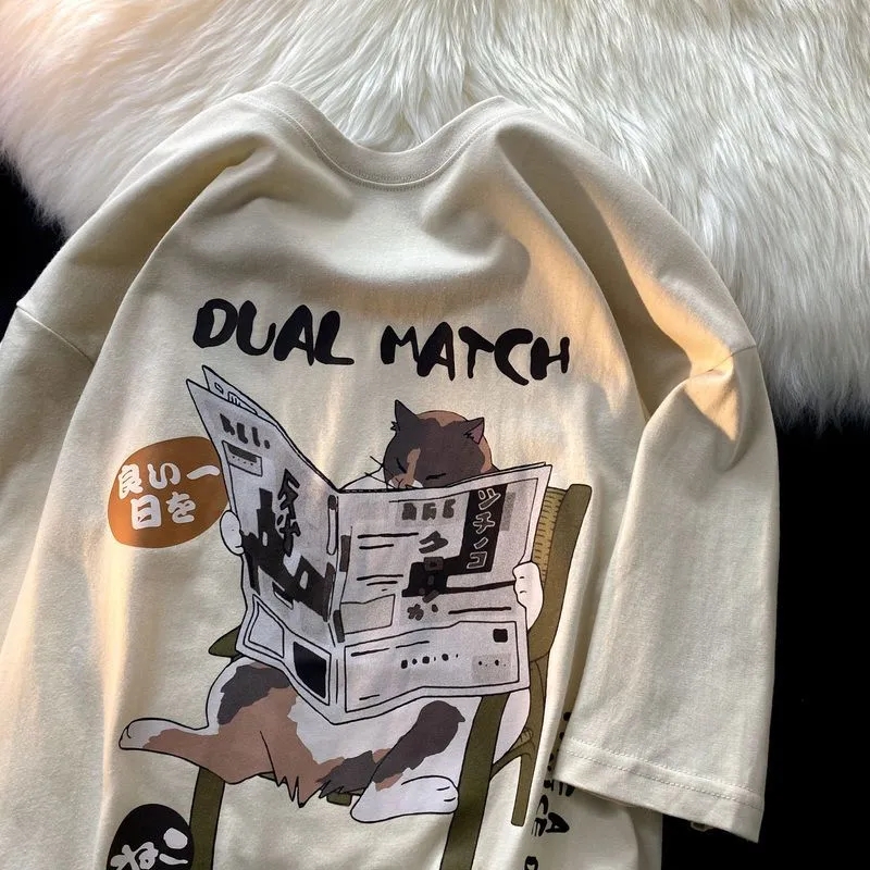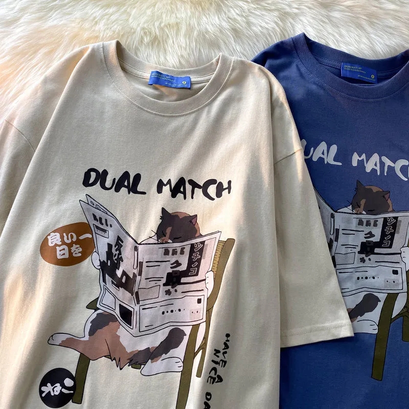 Retro Cat Newspaper Print Short Sleeve T-shirt