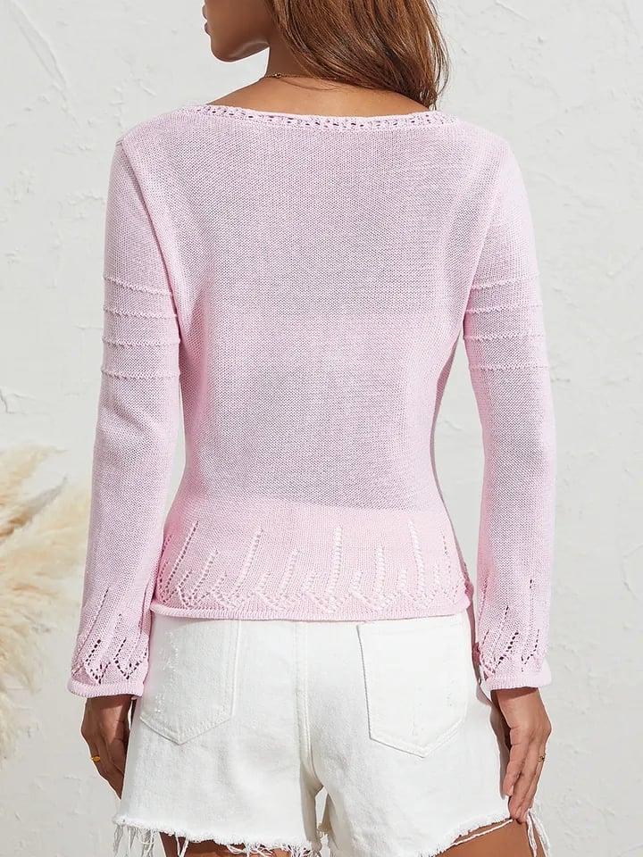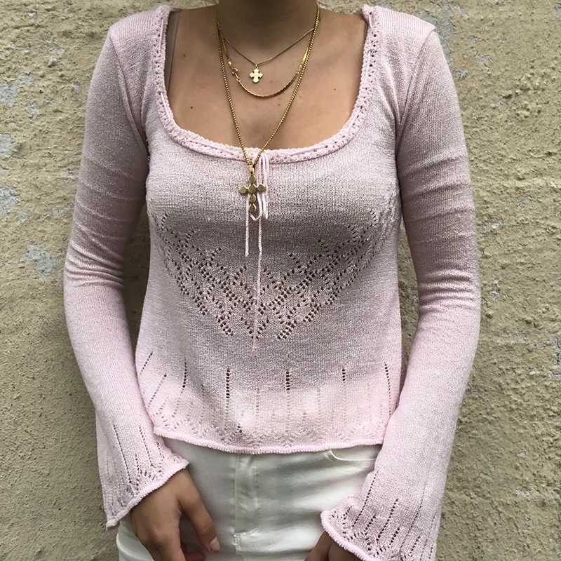 Pink Hollow Out Tie Up Knit Long Sleeve Flare Top