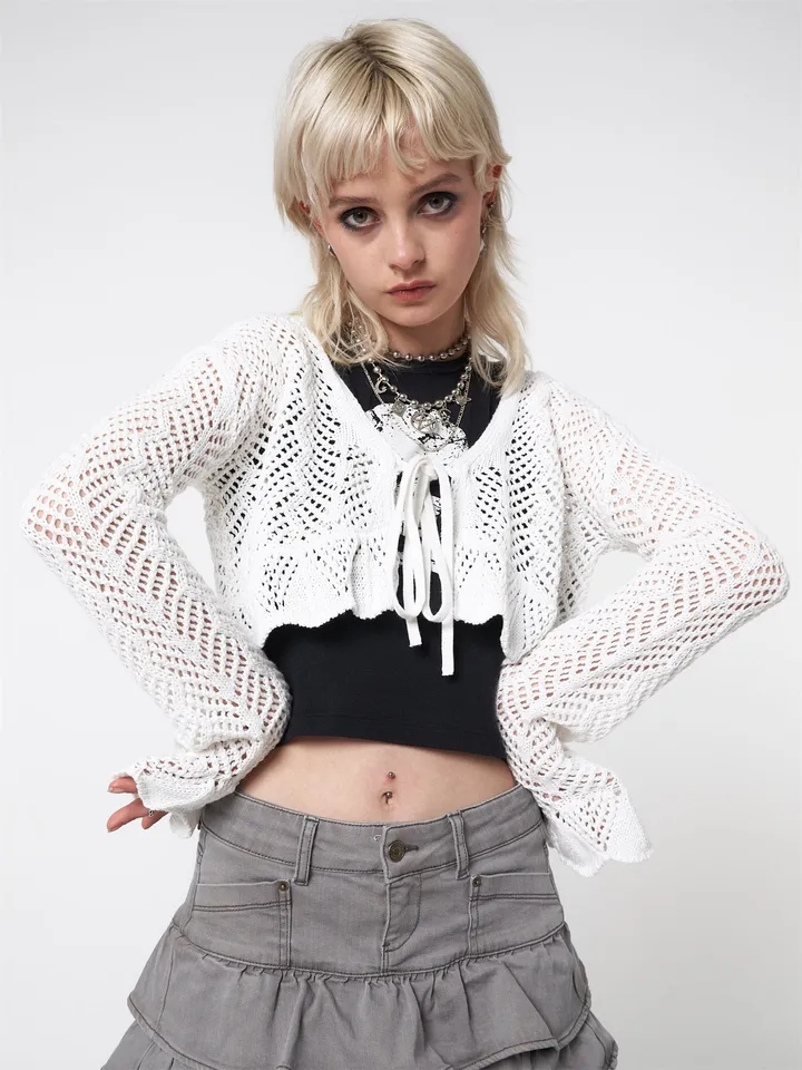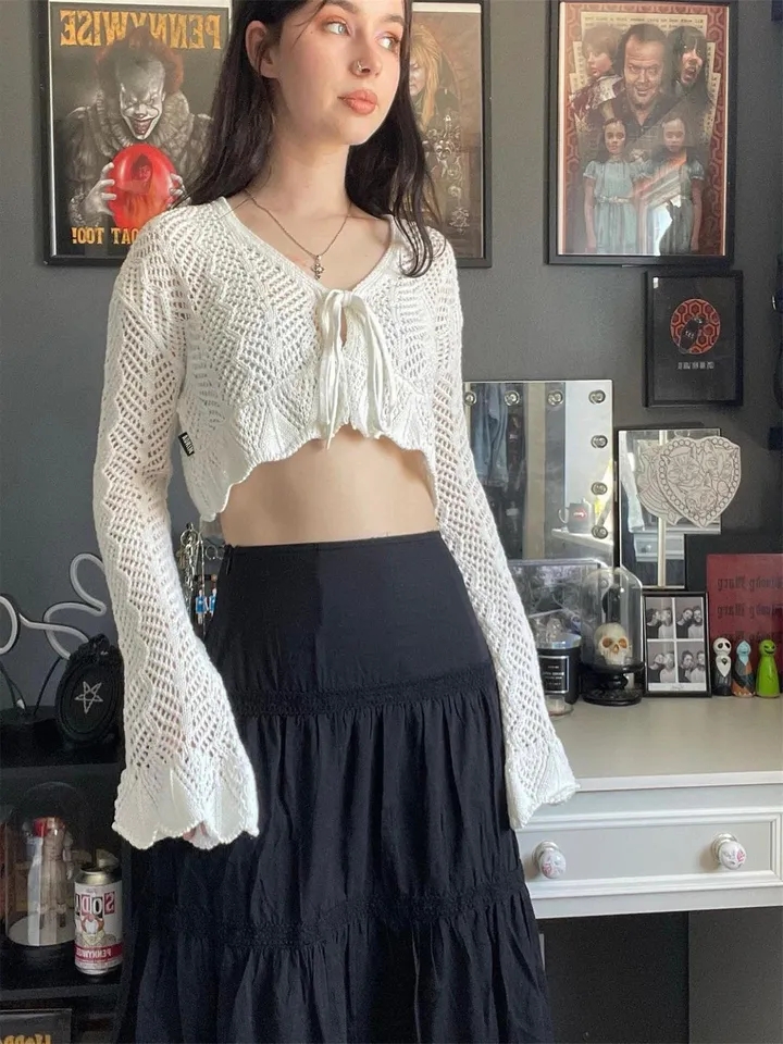 Crochet Tie Up V Neck Flare Long Sleeve Top