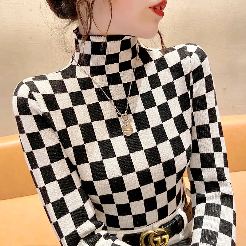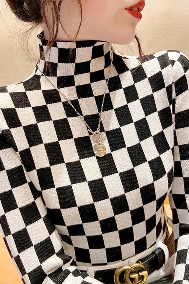 Black & White Checkered Turtleneck Long Sleeve Shirt