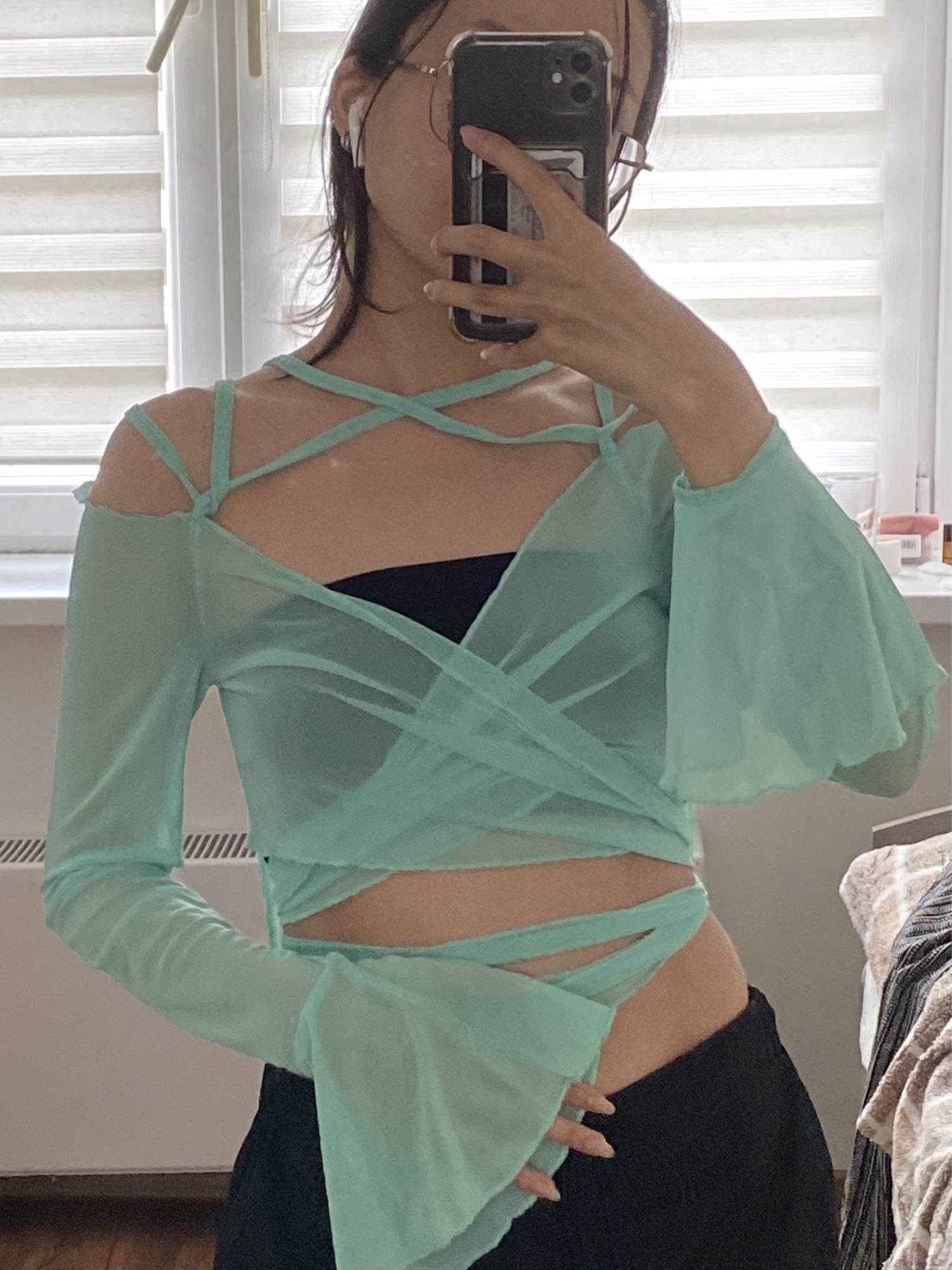 Blue See Through V Neck Bandage Long Sleeve Shirt