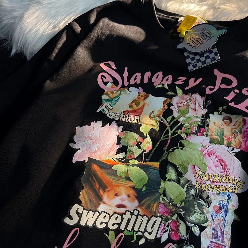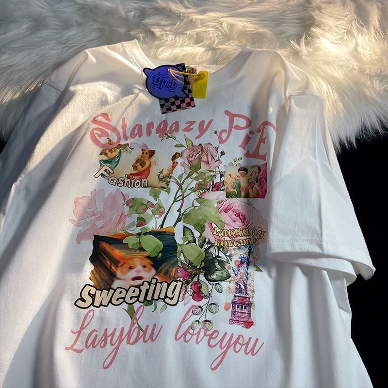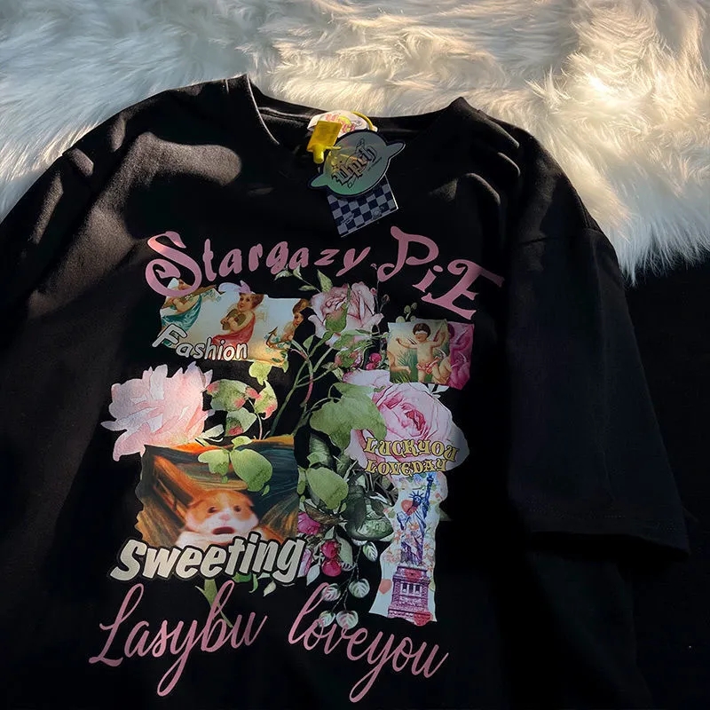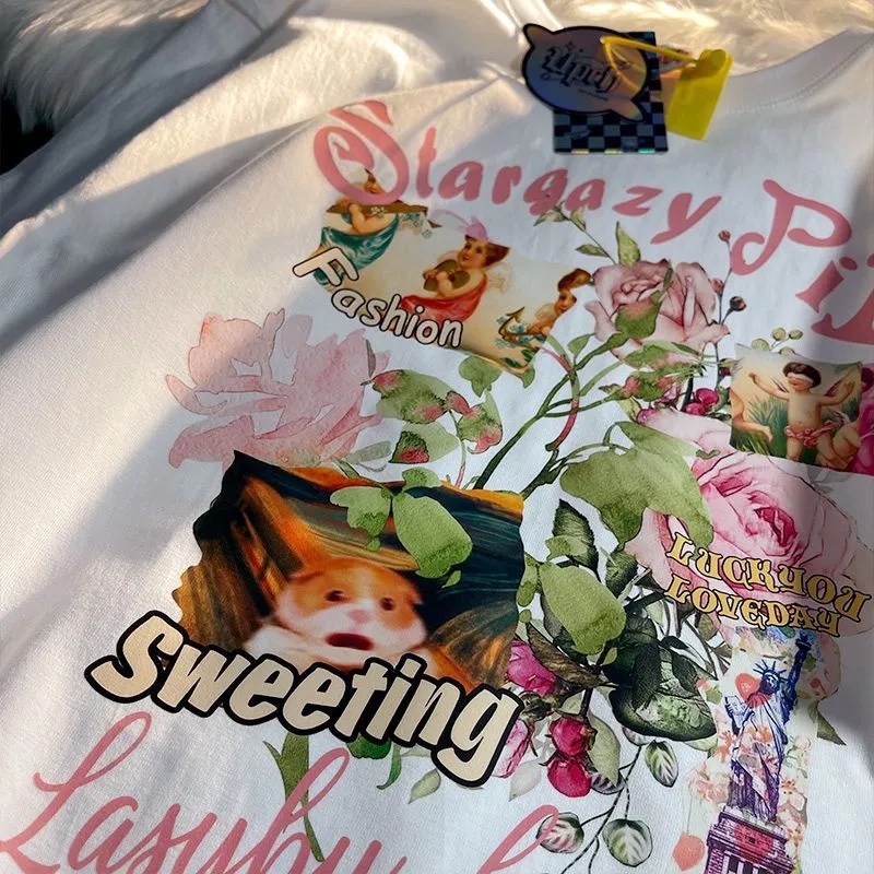 Sweet Floral Print Puff Bell Sleeve Short T-shirt Button Round Neck Crop Top Summer Aesthetic Casual E-Girl Kawaii Korean Japanese Harajuku