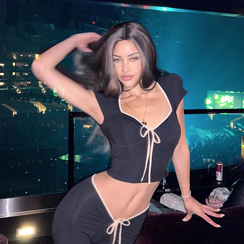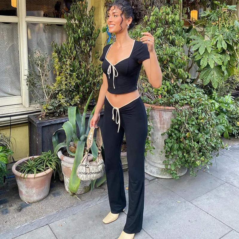 Cute Sexy 2pcs Set Black Halter Crop Top Tank Buckle Long Sleeve T-shirt Tracksuit Summer Aesthetic Casual E-Girl Kawaii Korean Japanese Harajuku
