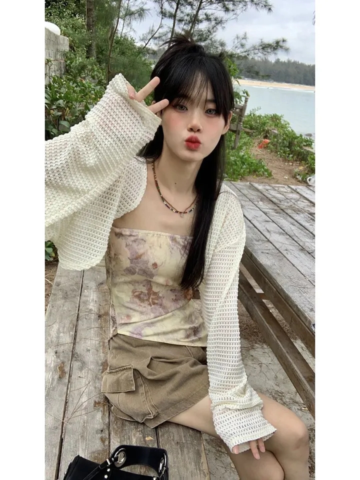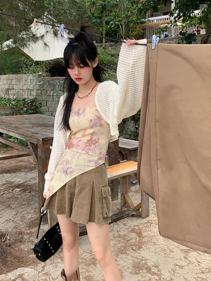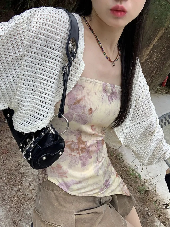 2PCS Patchwork Bow Lace Camisole + Knit Cardigan