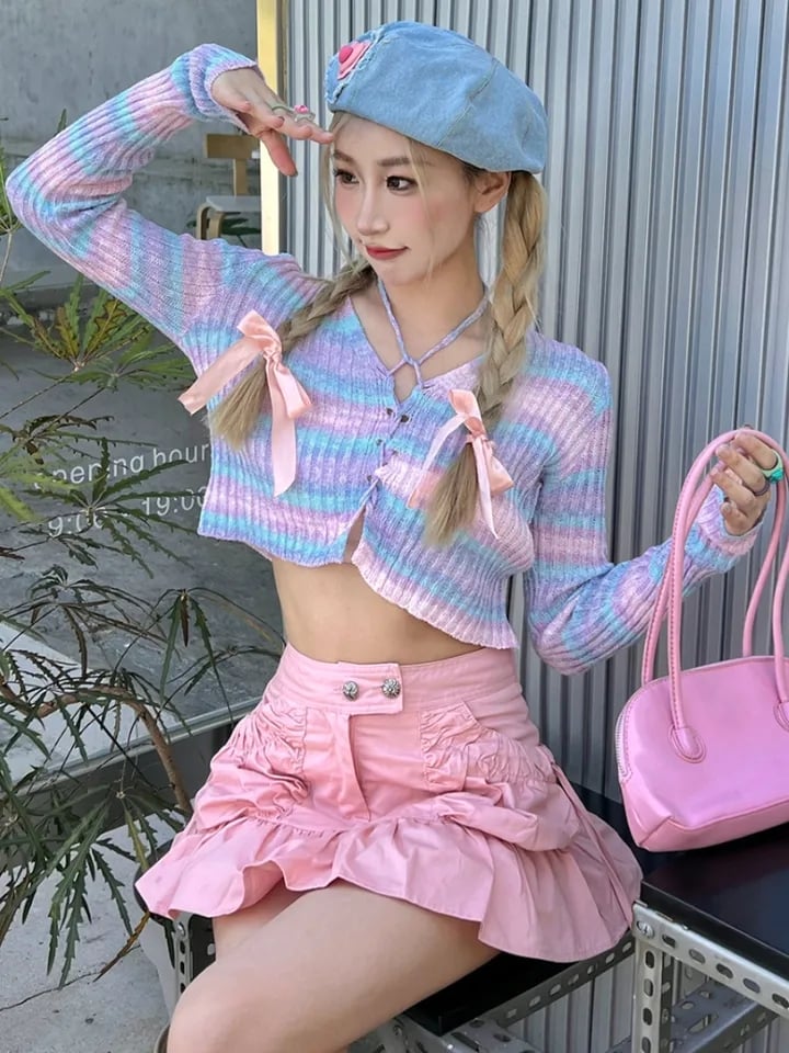 Cute Vintage O Neck Button Down Knit Cardigan Crop Top Sweater Sweatshirt Pullover Jumper E-Girl Kawaii Korean Japanese Harajuku Streetwear