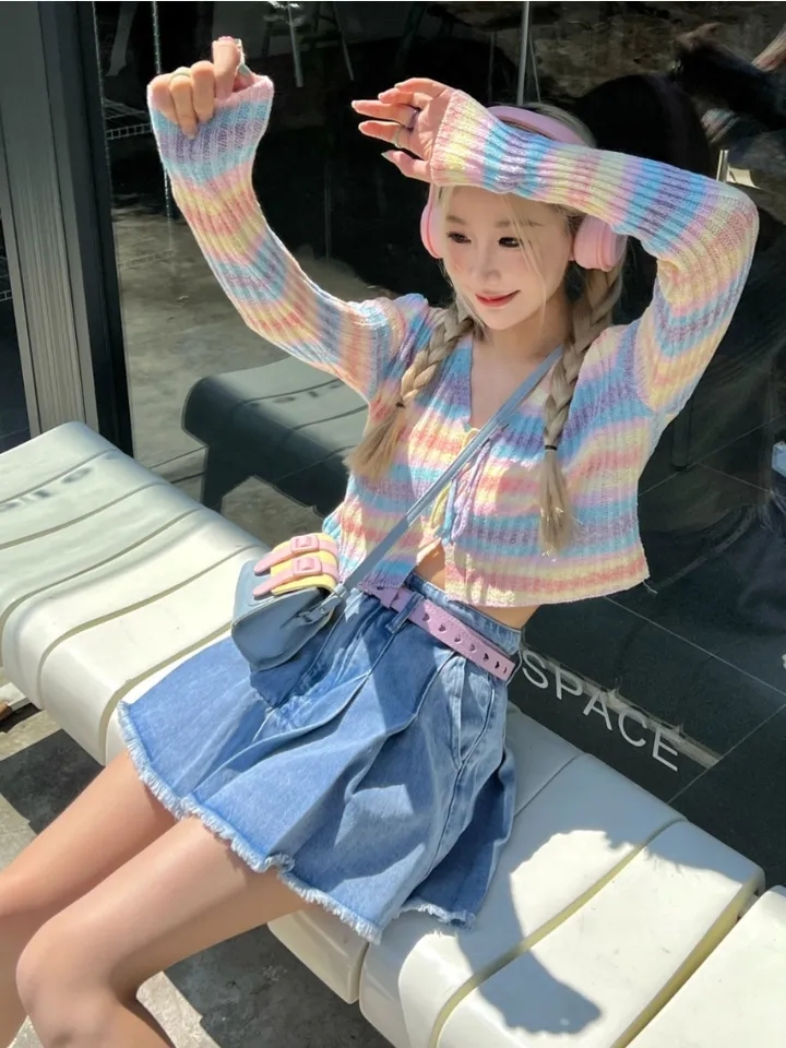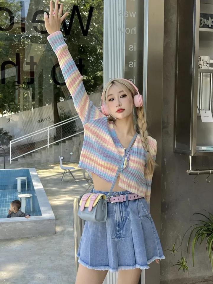 Rainbow Striped V Neck Cropped Cardigan
