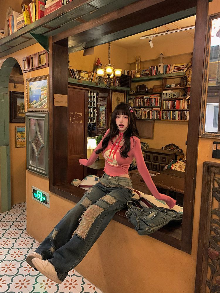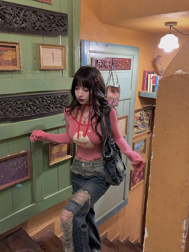 Pink Dog Graphic Print Frill Long Sleeve Shirt