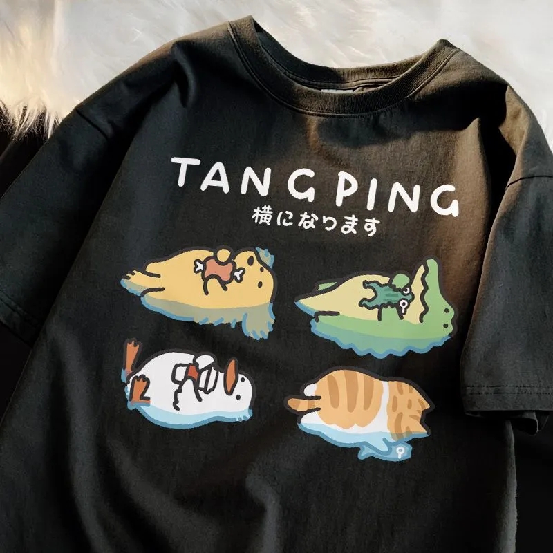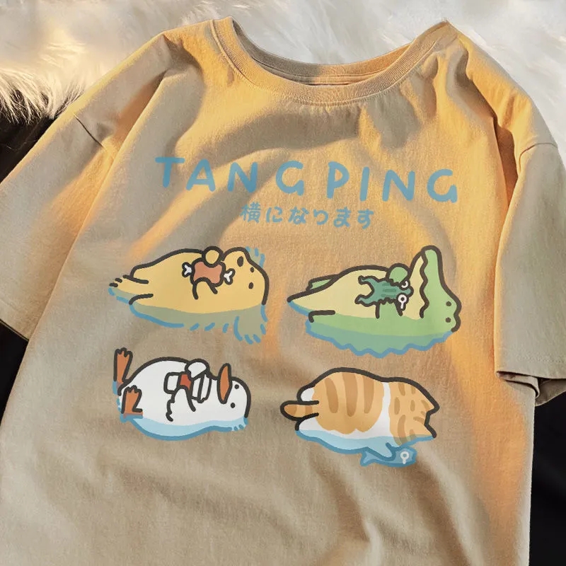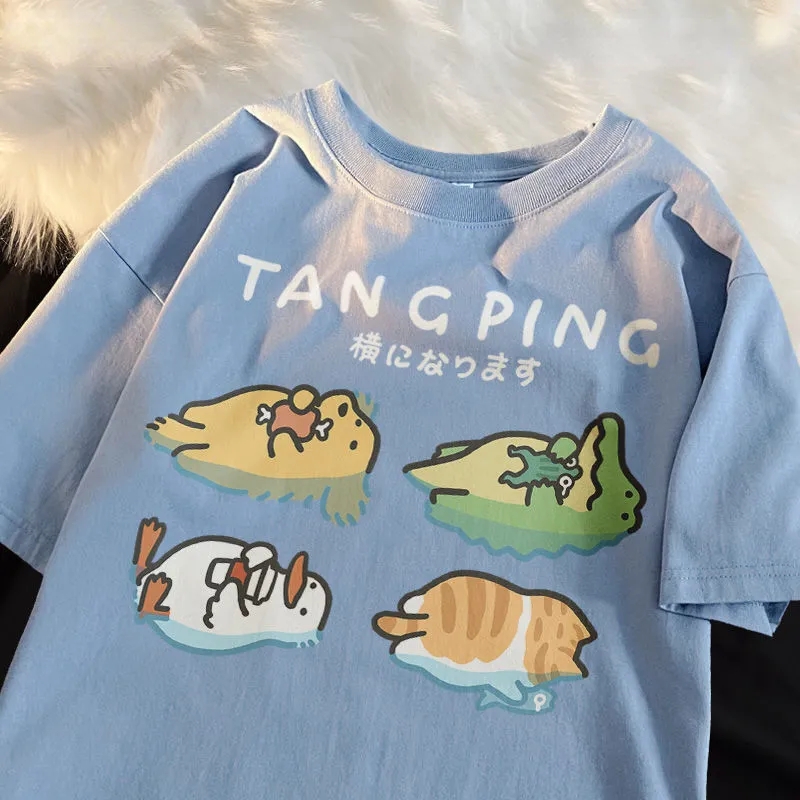 White Nervous Animal Graphic Cartoon Print Loose Oversized Short Sleeve T-shirt Top Summer Causal E-Girl Kawaii Korean Japanese Harajuku Streetwear