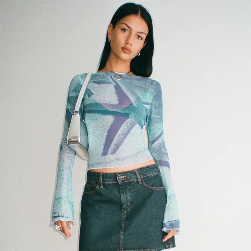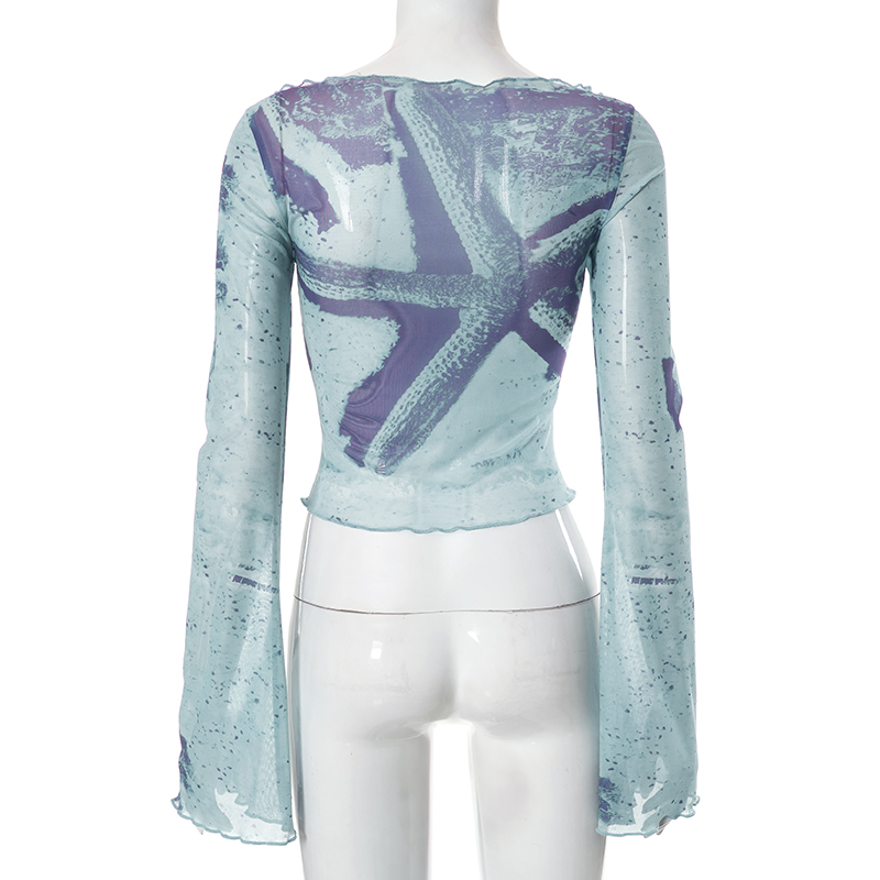 Starfish Mesh Graphic Print Flare Long Sleeve Shirt