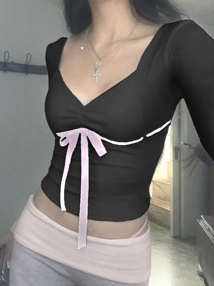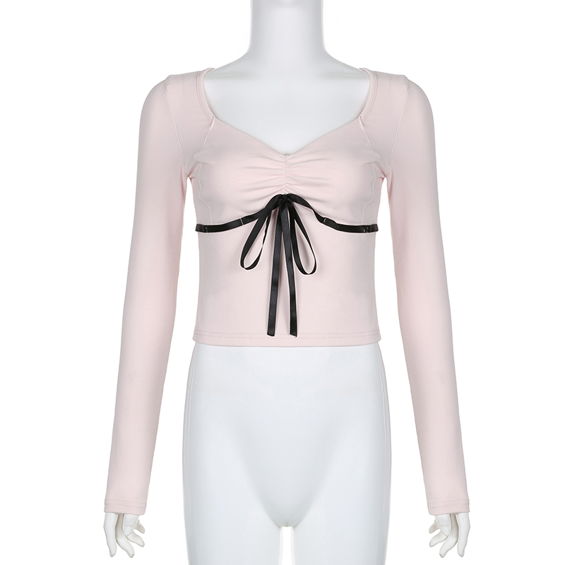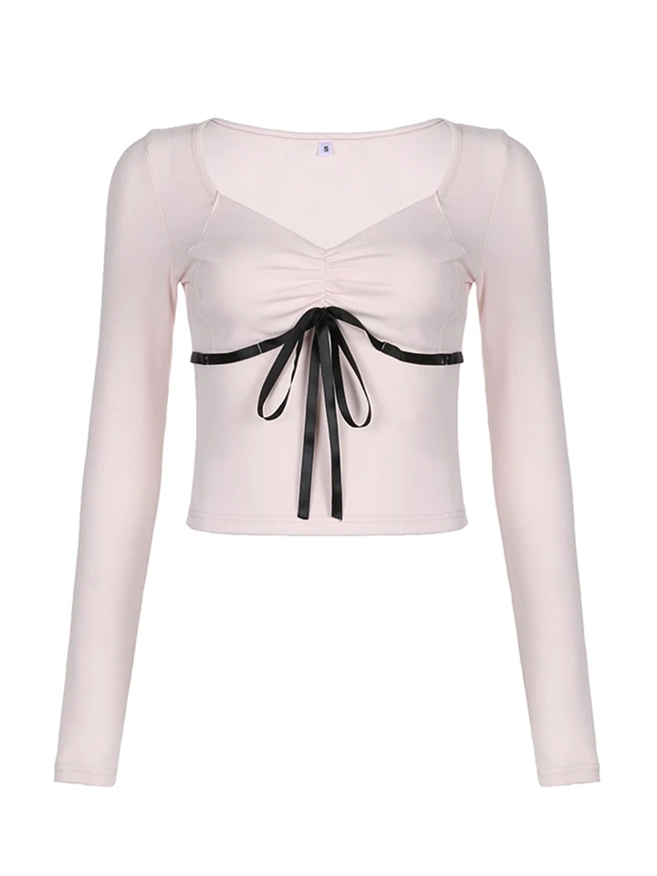 Pink Chiffon Bow Tie Flare Long Sleeve Blouse