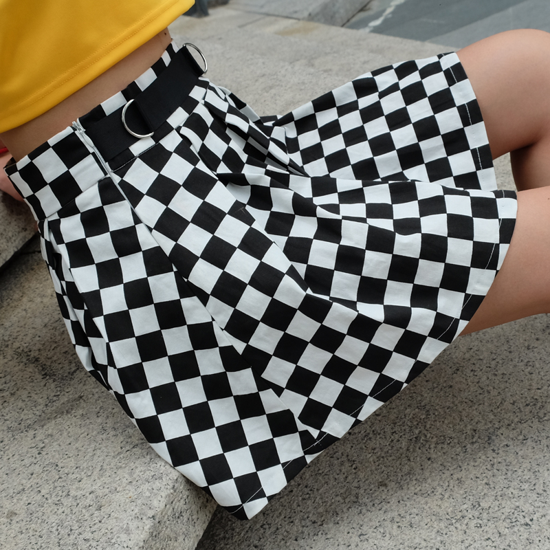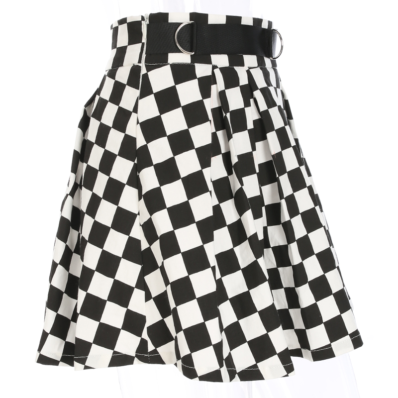 Cute Sexy Checkered Pleated Black White Sash High Waisted Skater Skirt E-Girl Kawaii Korean Japanese Harajuku Streetwear