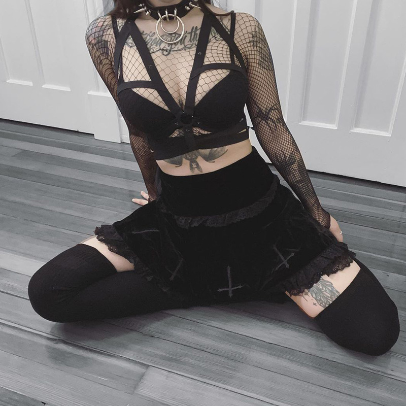 Cute Sexy Goth Black Cross Skirt Vintage Lace Trim A-Line Grunge Punk High Waist Ruffle Summer E-Girl Kawaii Korean Japanese Harajuku Streetwear