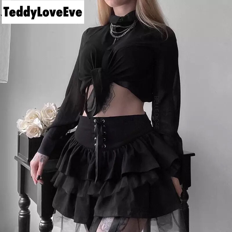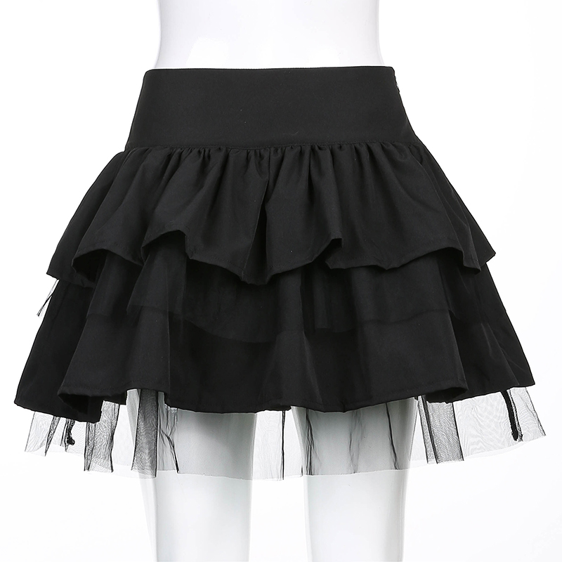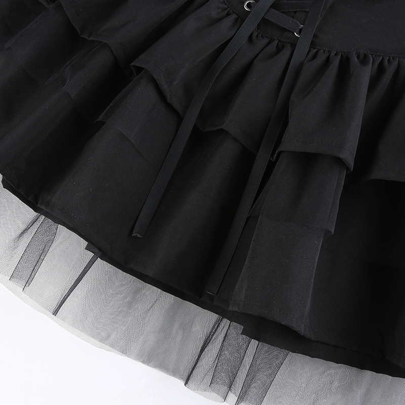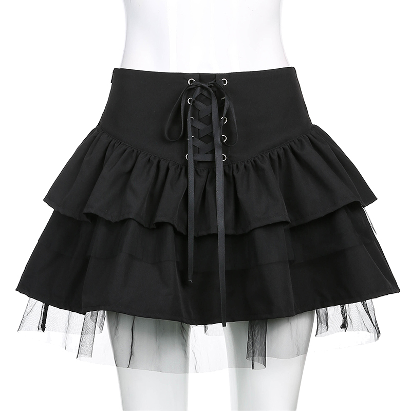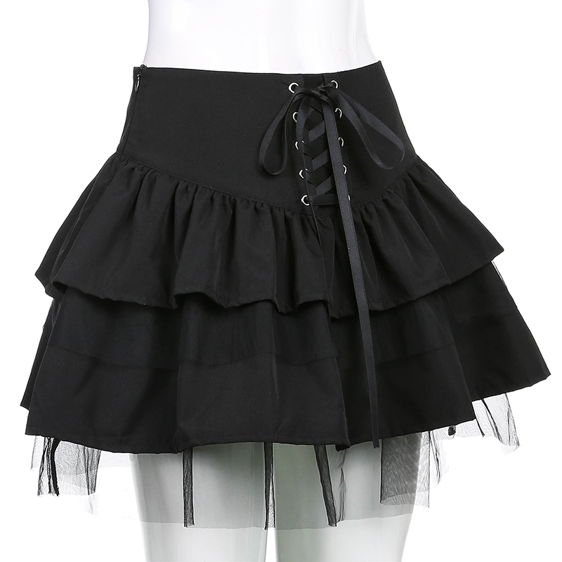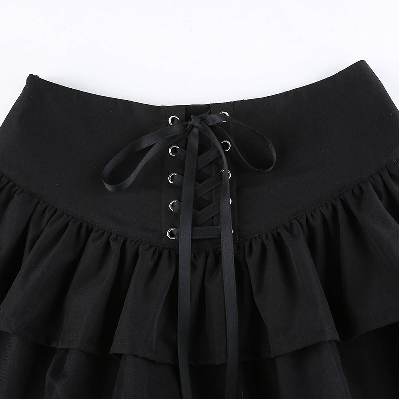 Cute Black Goth Lace Up High Waisted Ruffle Skirt Punk Bandage A-line Lace Trim Tutu Casual E-Girl Kawaii Korean Japanese Harajuku Streetwear
