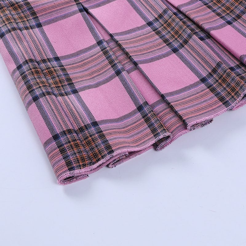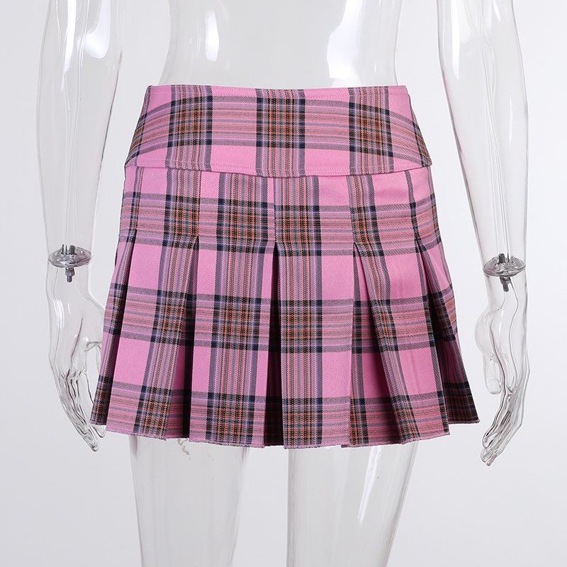 Cute Pink Plaid Checkered Pleated High Waisted Mini Skirt A-line Chic Goth Punk Club E-Girl Kawaii Korean Japanese Harajuku Streetwear