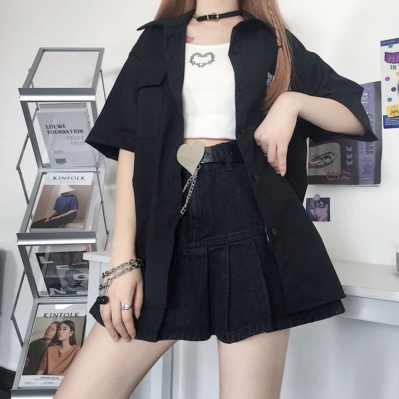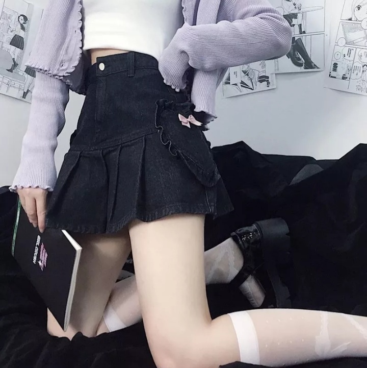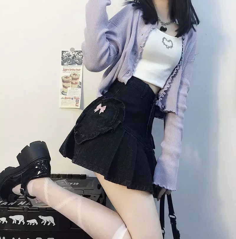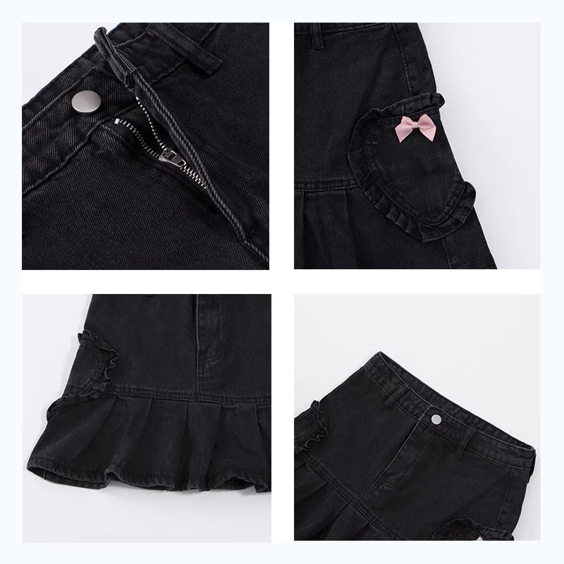 Cute Black Heart Bow Pocket Denim Mini Skirt High Waisted Pleated Aesthetic Goth Casual Summer E-Girl Kawaii Korean Japanese Harajuku