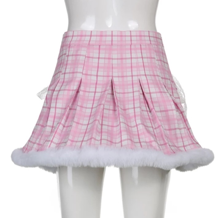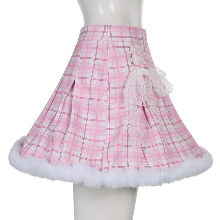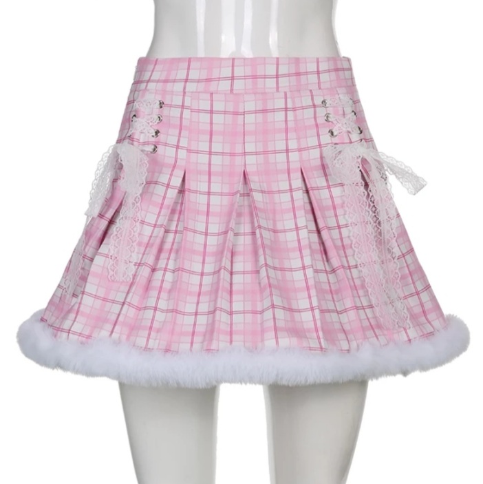 Cute Pink Plaid Feather Lace Up Pleated High Waist A-line Mini Skirt Summer Aesthetic Casual E-Girl Kawaii Korean Japanese Harajuku