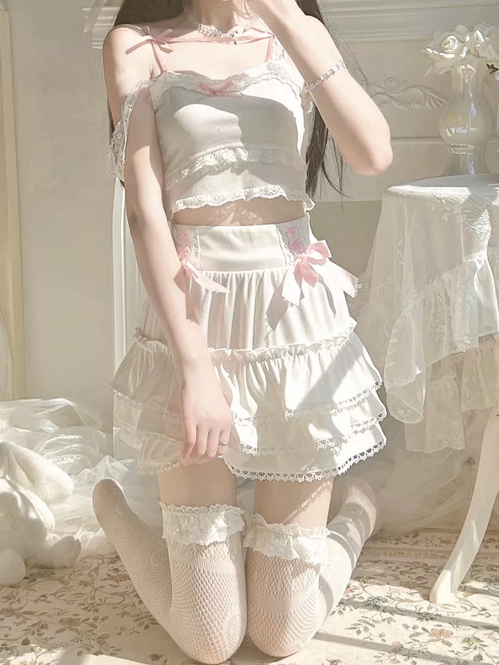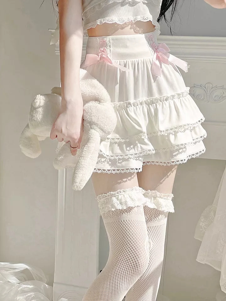 Cute White Black Chain Lace High Waist A-line Pleated Skirt Summer Aesthetic Casual E-Girl Kawaii Korean Japanese Harajuku