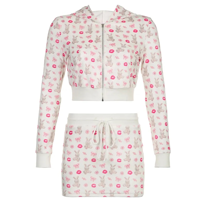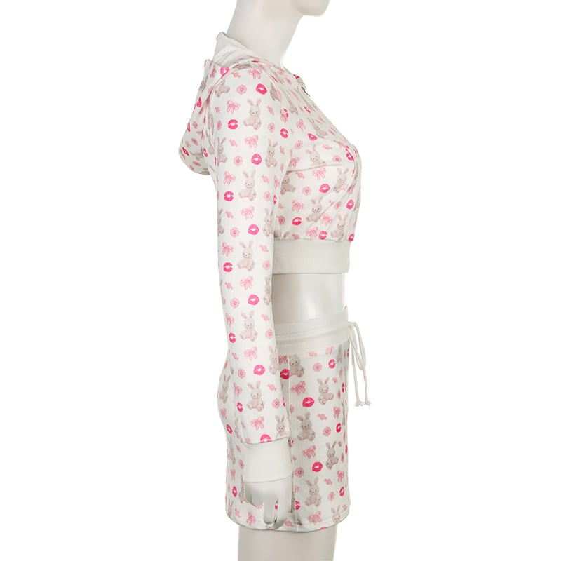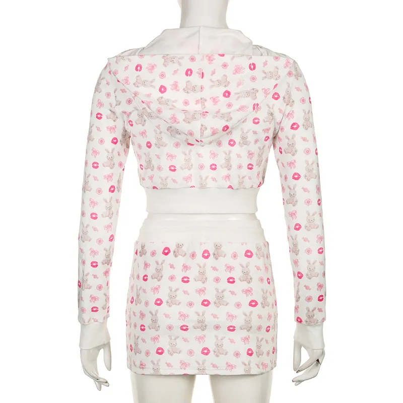 2PCS Rabbit Print Tracksuit Hoodie + Mini Skirt Set