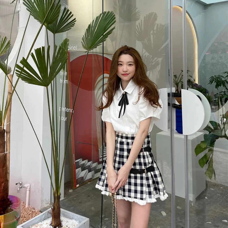 Cute 2pcs Set White Puff Ruffles Sleeve Shirt + Aline Pleated Preppy Mini Skirt Summer Aesthetic Casual E-Girl Kawaii Korean Japanese Harajuku