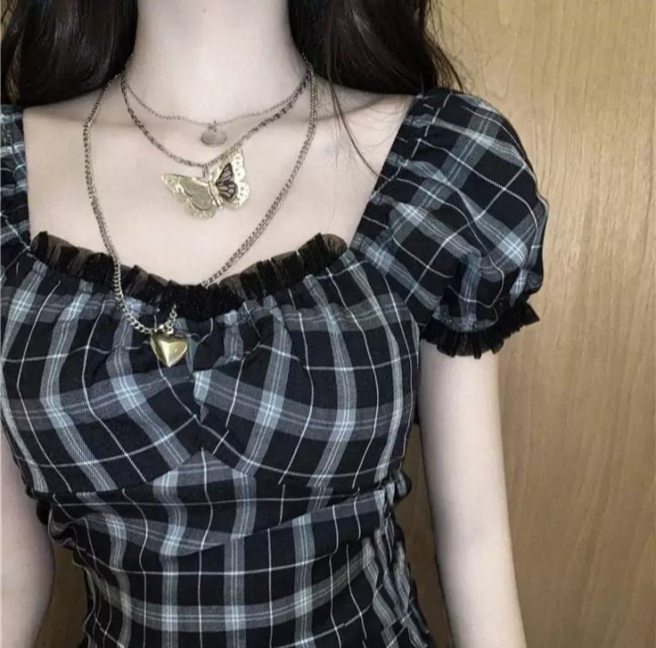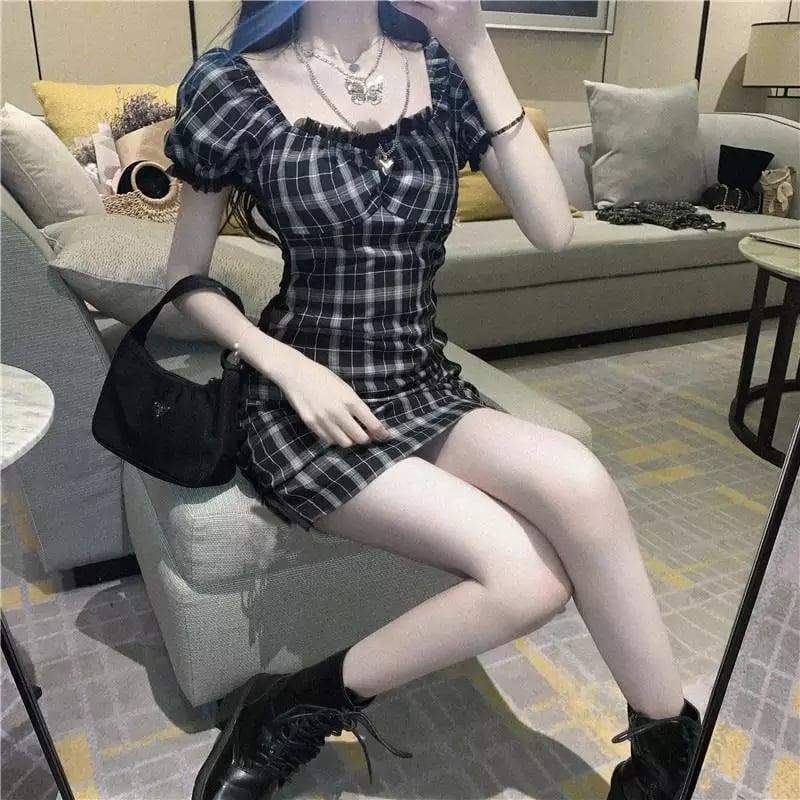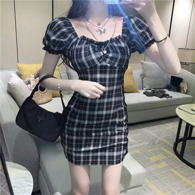 Cute Black White Plaid Puff Sleeve Square Collar Mini Dress Elegant Summer Aesthetic Casual E-Girl Kawaii Korean Japanese Harajuku
