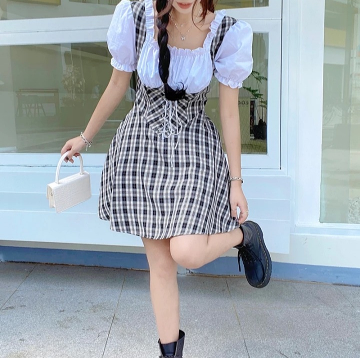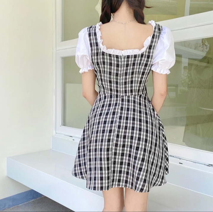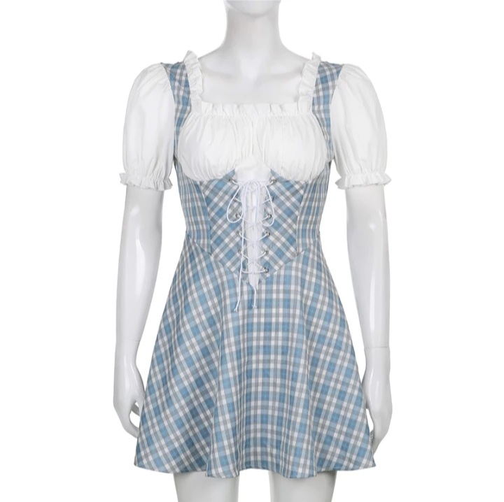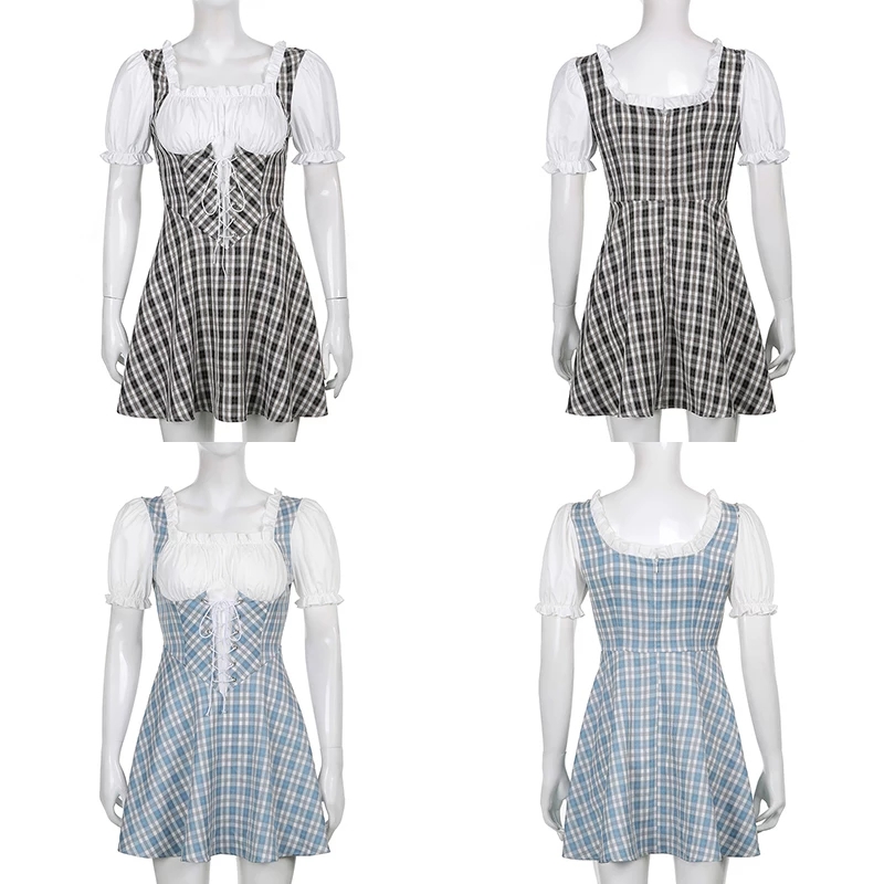 Cute Sweet Plaid Patchwork Lace Up Corset Ruffle Mini A-line Dress Summer Aesthetic Casual E-Girl Kawaii Korean Japanese Harajuku