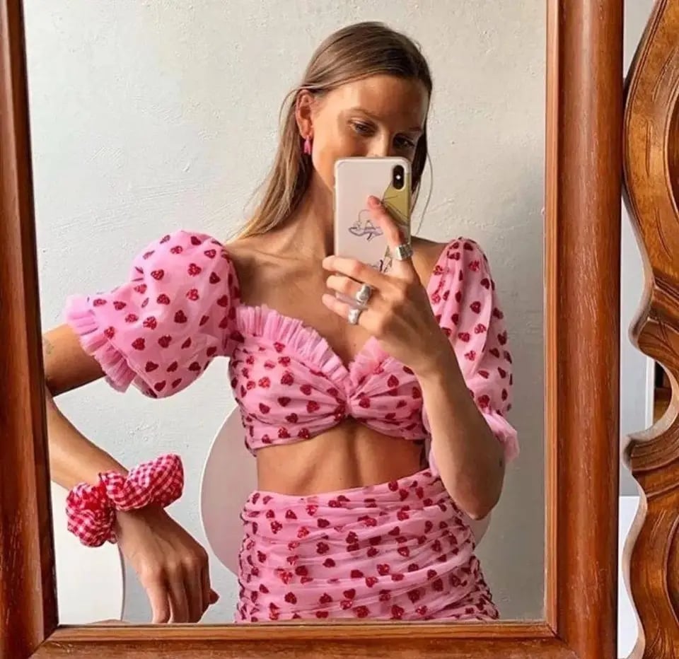 2PCS Sweet Pink Glitter Heart Crop Top + Mini Skirt