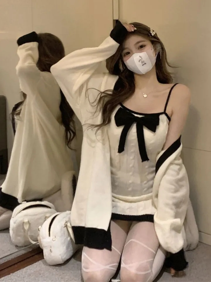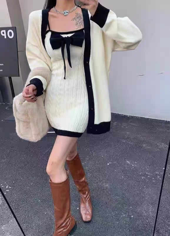 2 Piece White Knit Bow Dress + Sweater