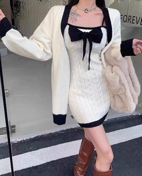 2PCS Rose Button Knit Dress + Cardigan