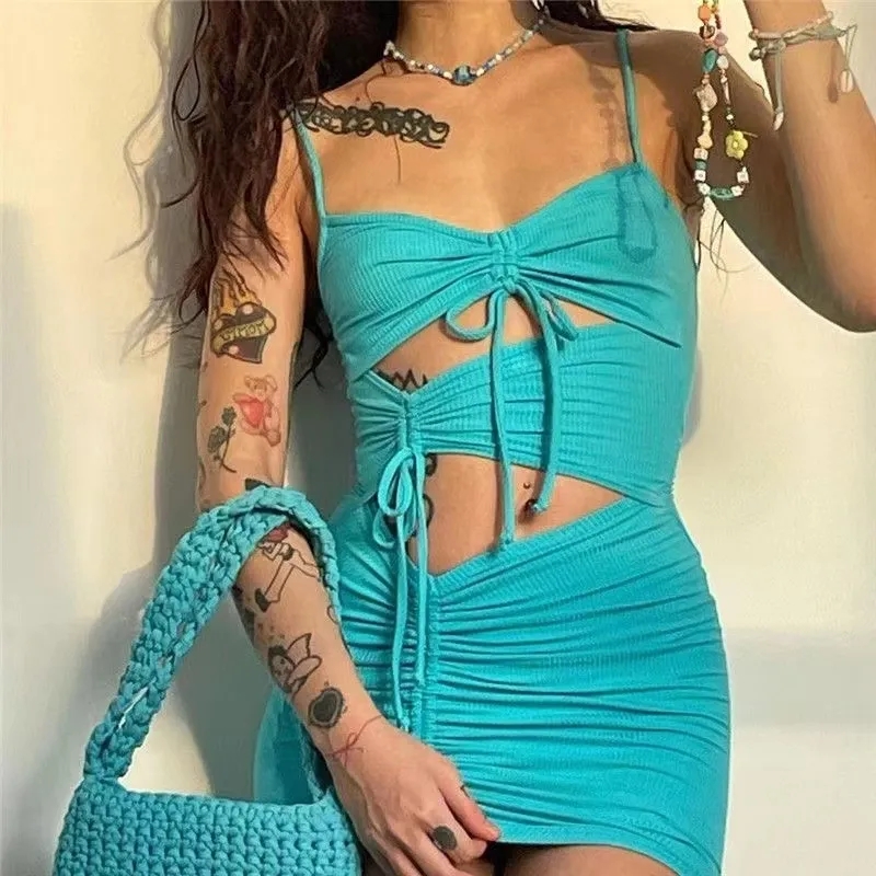 Blue Drawstring Bandage Cut Out Bodycon Dress