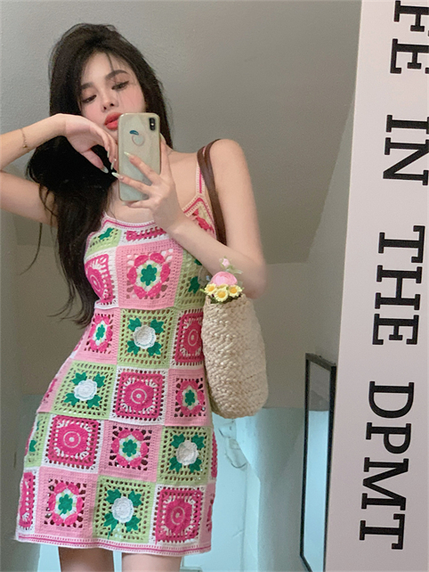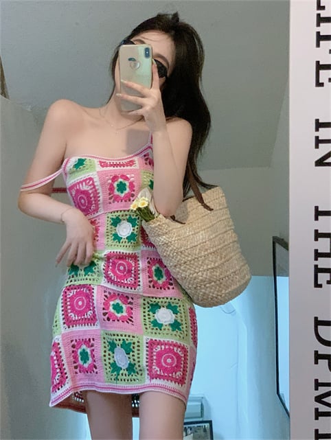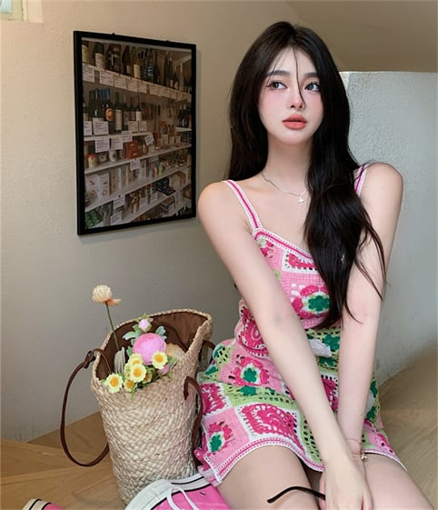 Pink Strawberry Crochet Knit Top + Sash Beach Mini Skirt