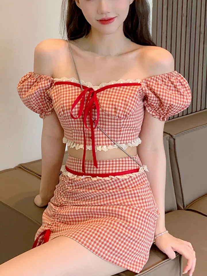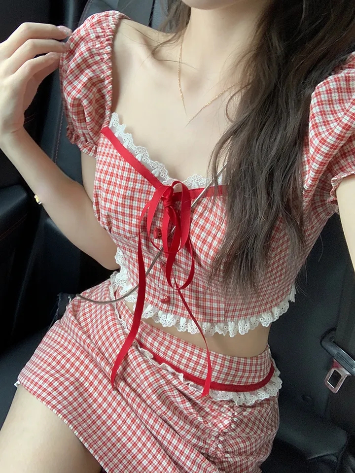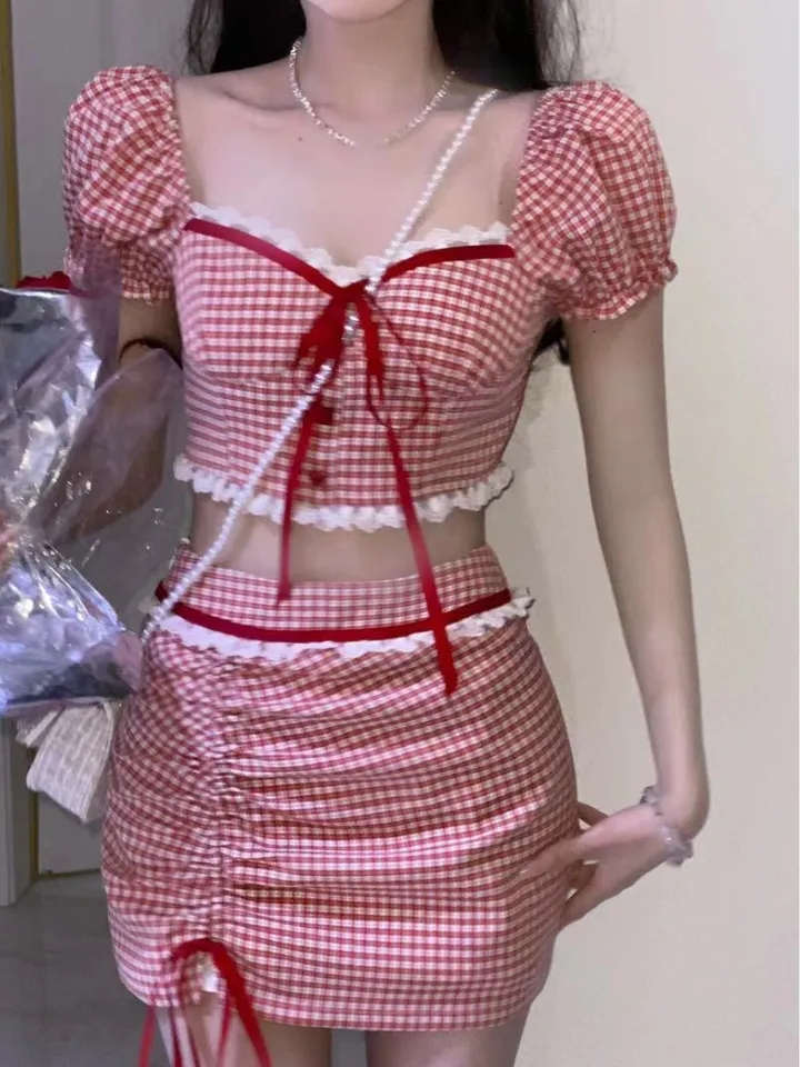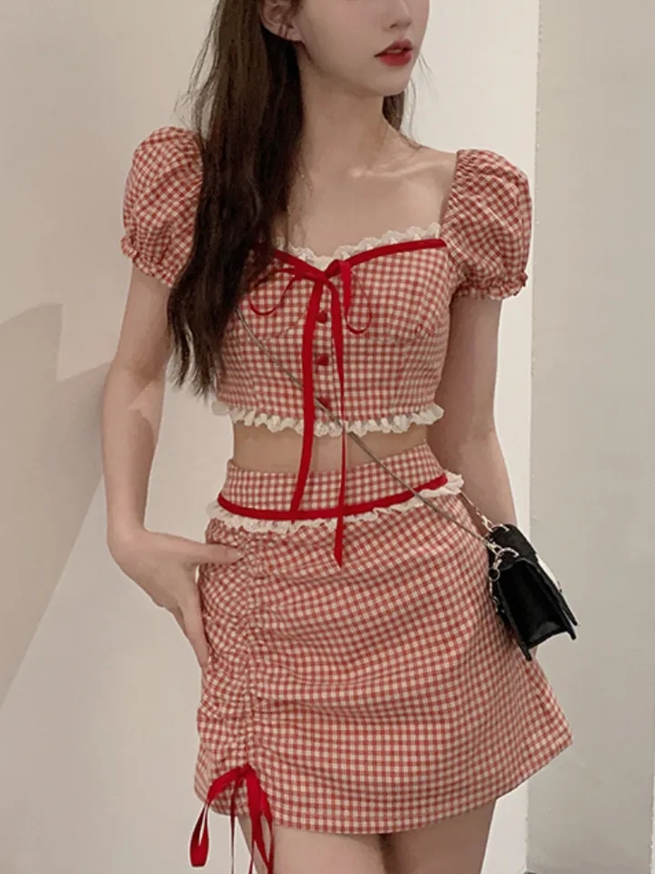 Cute 2pcs Set White Puff Ruffles Sleeve Shirt + Aline Pleated Preppy Mini Skirt Summer Aesthetic Casual E-Girl Kawaii Korean Japanese Harajuku