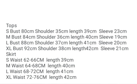 100% Brand New and High Quality . Material: Polyester, Cotton . Size: Available in images. Includes: Top + Skirt.
