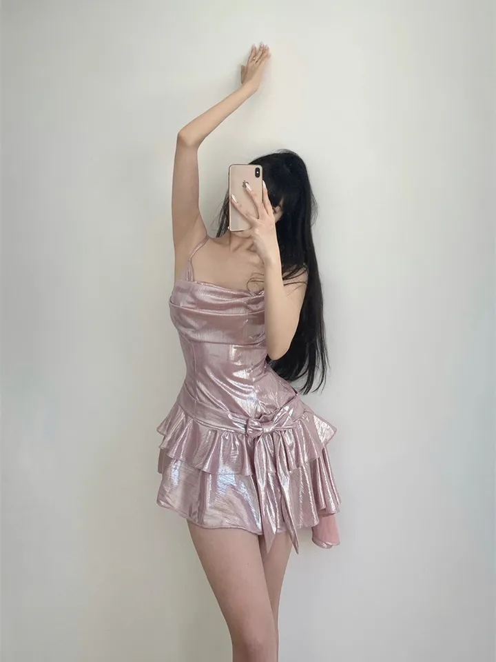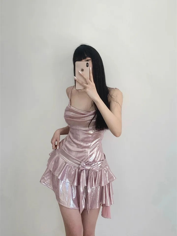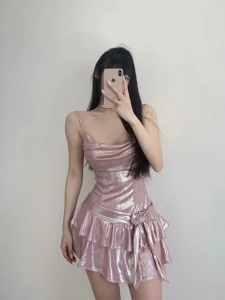 Pink Sequin Ruffle Asymmetrical Mini Dress