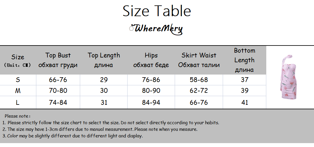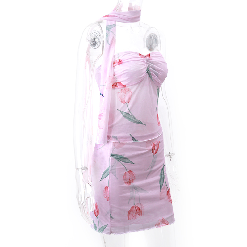 2PCS Pink Tulip Print Tube Top + Mini Skirt