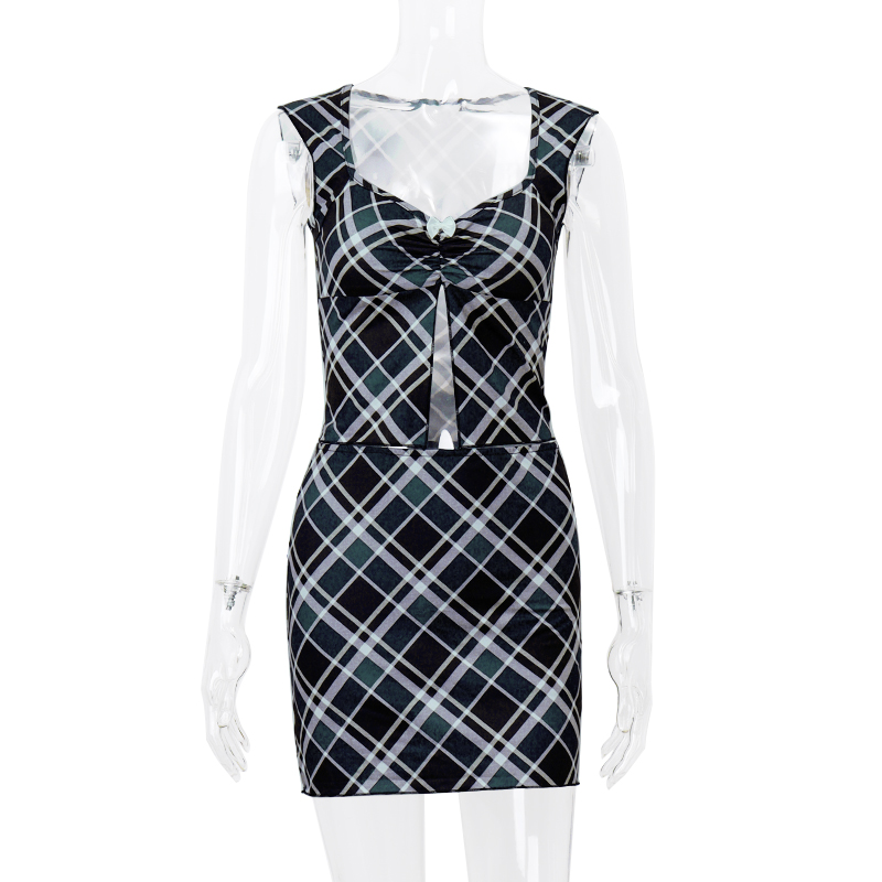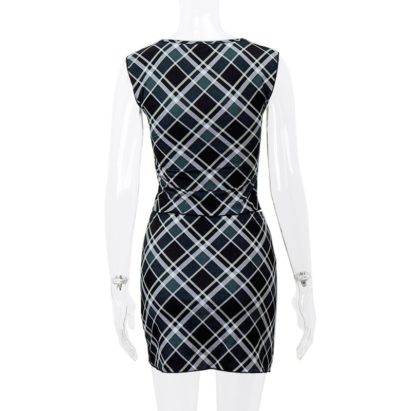 2PCS Black & White Plaid V Neck Top + Mini Skirt