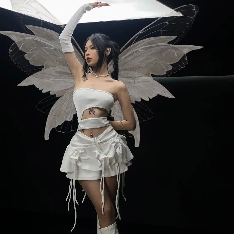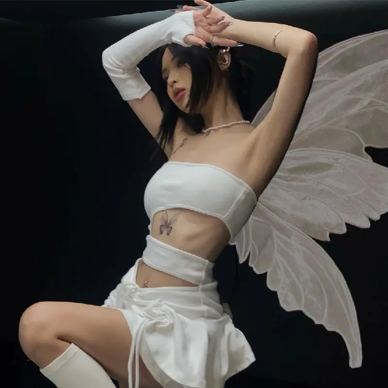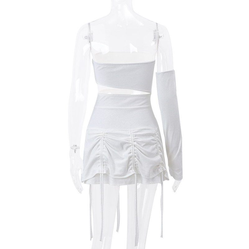White Hollow Out Drawstring Strapless Mini Dress