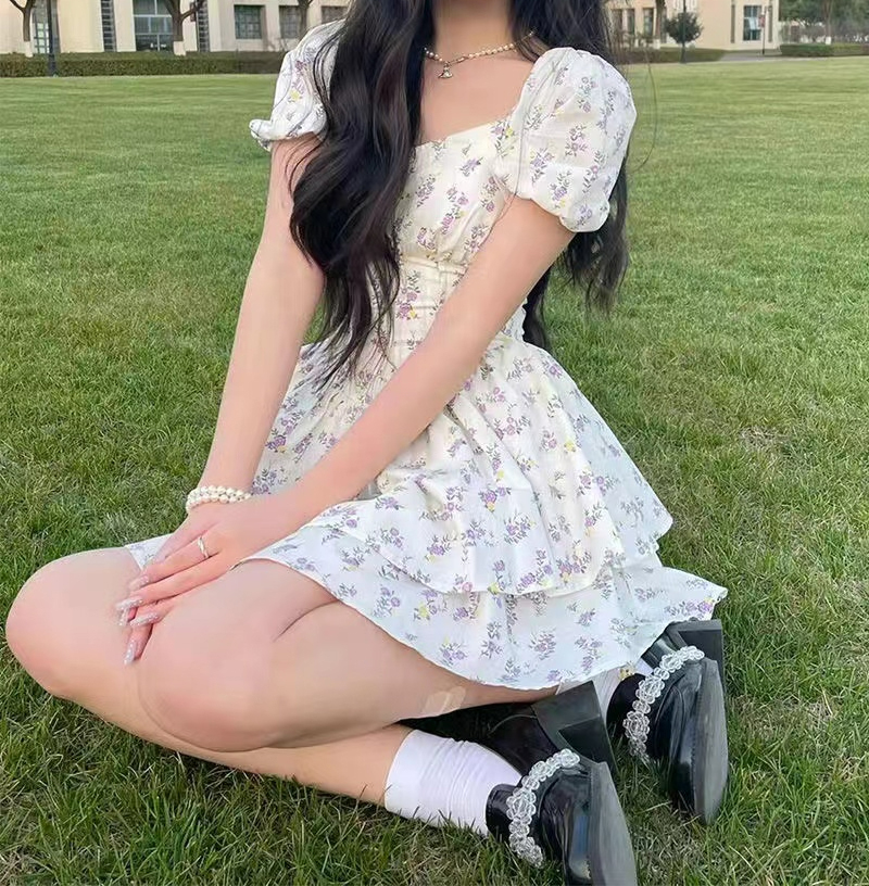 Cute Summer Square Neck Lace Patchwork Elegant Bodycon Short Sleeve Mini Dress Aesthetic Casual E-Girl Kawaii Korean Japanese Harajuku