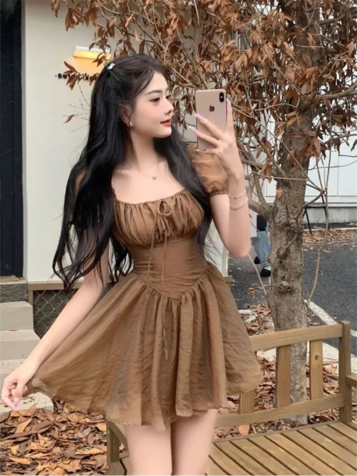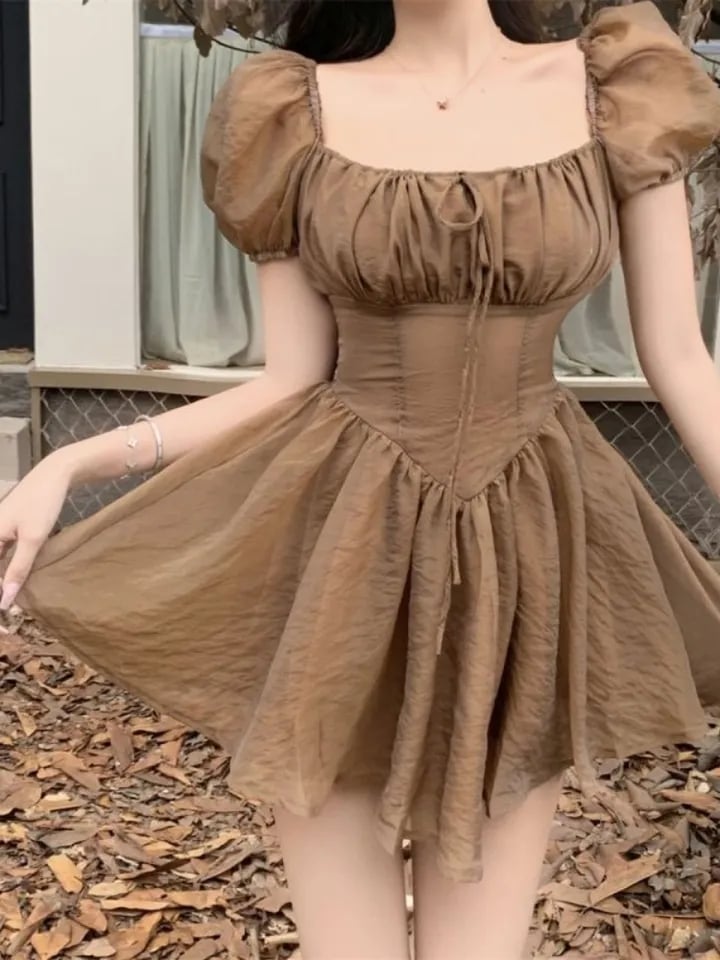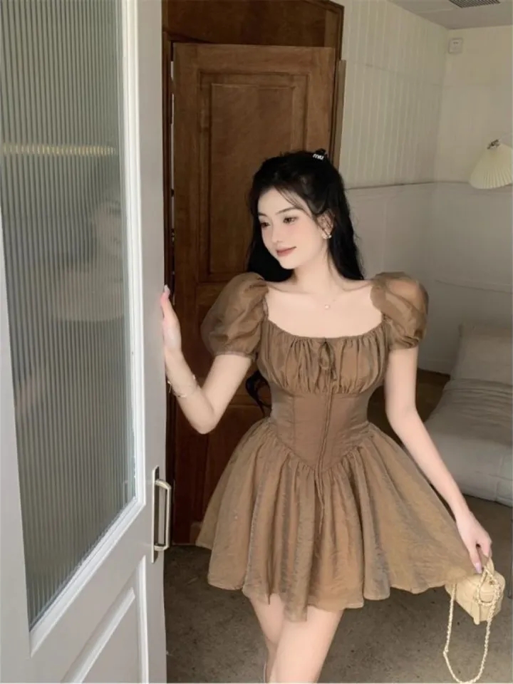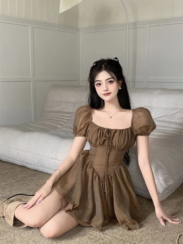 Cute Sexy Blue Cloud Sky Princess Square Neck Puff Sleeve Mini Party Dress Summer Aesthetic E-Girl Kawaii Korean Japanese Harajuku