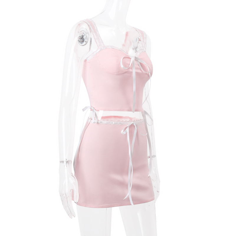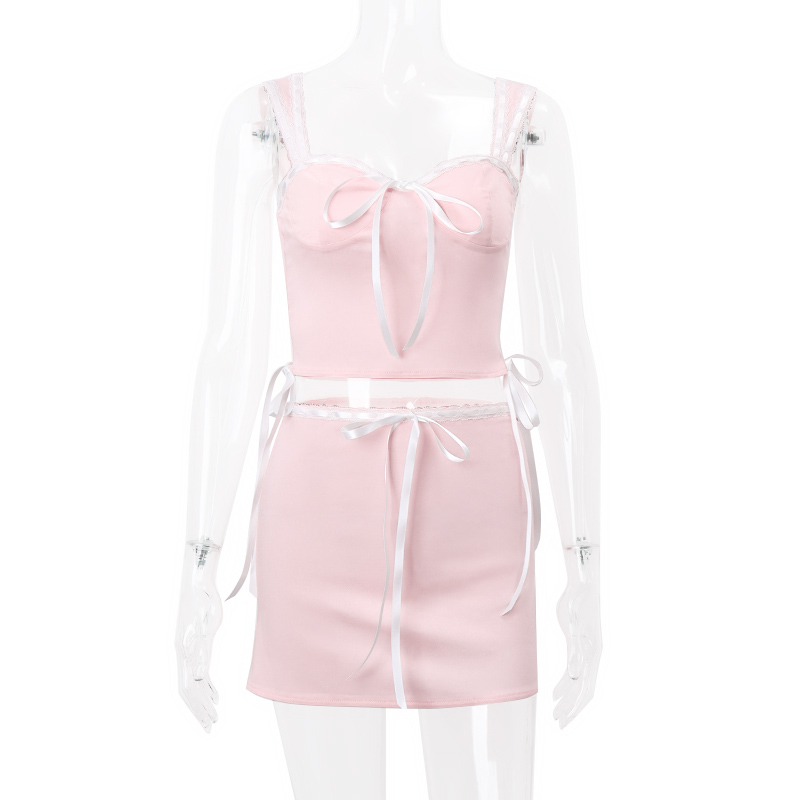 2PCS Sweet Pink Bow Sleeveless Lace Top + Skirt