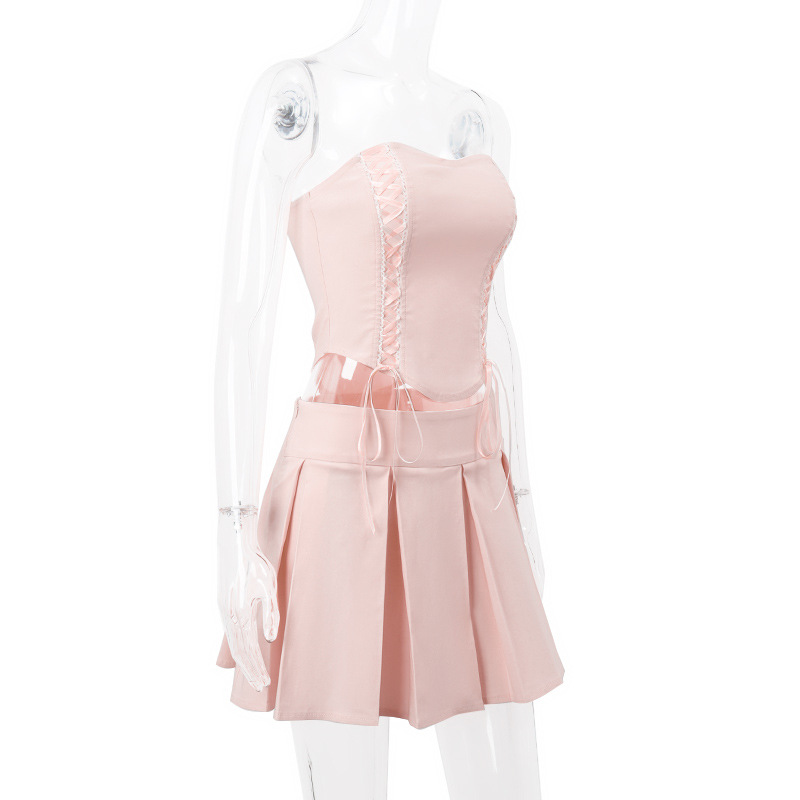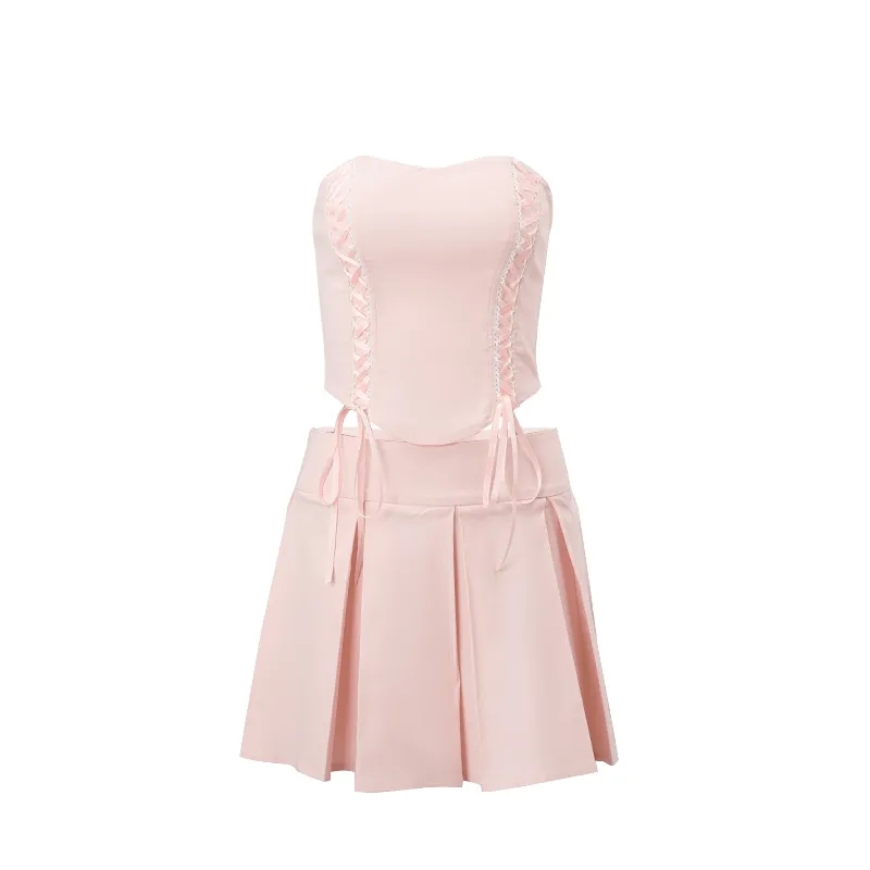 2PCS Pink Side Cross Strapless Top + Pleated Mini Skirt